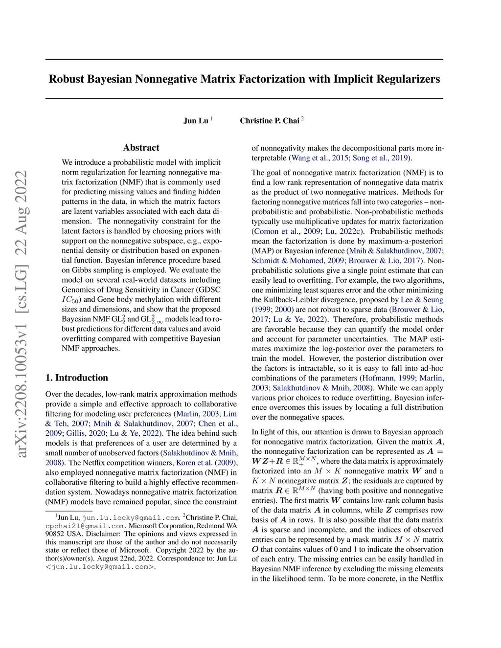We introduce a probabilistic model with implicit norm regularization for learning nonnegative matrix factorization (NMF) that is commonly used for predicting missing values and finding hidden patterns in the data, in which the matrix factors are latent variables associated with each data dimension. The nonnegativity constraint for the latent factors is handled by choosing priors with support on the nonnegative subspace, e.g., exponential density or distribution based on exponential function. Bayesian inference procedure based on Gibbs sampling is employed. We evaluate the model on several real-world datasets including Genomics of Drug Sensitivity in Cancer (GDSC ) and Gene body methylation with different sizes and dimensions, and show that the proposed Bayesian NMF GL and GL models lead to robust predictions for different data values and avoid overfitting compared with competitive Bayesian NMF approaches.
