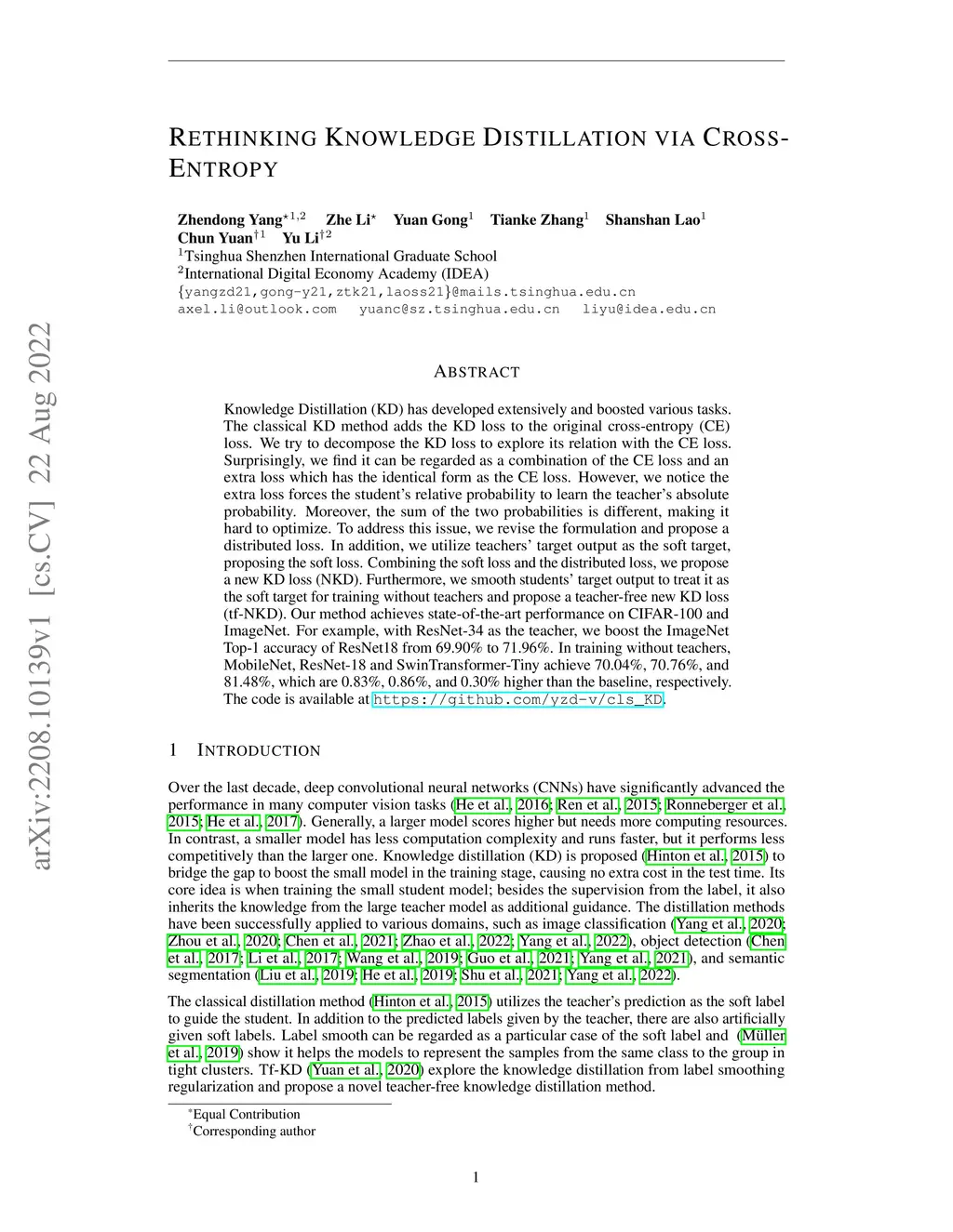 Knowledge Distillation (KD) has developed extensively and boosted various tasks. The classical KD method adds the KD loss to the original cross-entropy (CE) loss. We try to decompose the KD loss to explore its relation with the CE loss. Surprisingly, we find it can be regarded as a combination of the CE loss and an extra loss which has the identical form as the CE loss. However, we notice the extra loss forces the student's relative probability to learn the teacher's absolute probability. Moreover, the sum of the two probabilities is different, making it hard to optimize. To address this issue, we revise the formulation and propose a distributed loss. In addition, we utilize teachers' target output as the soft target, proposing the soft loss. Combining the soft loss and the distributed loss, we propose a new KD loss (NKD). Furthermore, we smooth students' target output to treat it as the soft target for training without teachers and propose a teacher-free new KD loss (tf-NKD). Our method achieves state-of-the-art performance on CIFAR-100 and ImageNet. For example, with ResNet-34 as the teacher, we boost the ImageNet Top-1 accuracy of ResNet18 from 69.90% to 71.96%. In training without teachers, MobileNet, ResNet-18 and SwinTransformer-Tiny achieve 70.04%, 70.76%, and 81.48%, which are 0.83%, 0.86%, and 0.30% higher than the baseline, respectively. The code is available at https://github.com/yzd-v/cls_KD.