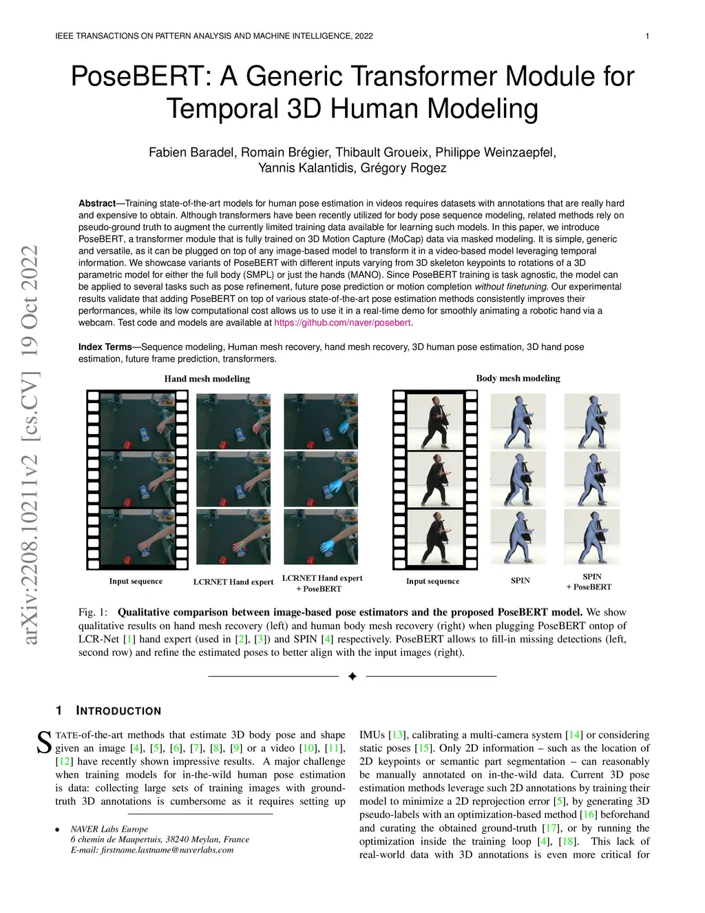 Training state-of-the-art models for human pose estimation in videos requires datasets with annotations that are really hard and expensive to obtain. Although transformers have been recently utilized for body pose sequence modeling, related methods rely on pseudo-ground truth to augment the currently limited training data available for learning such models. In this paper, we introduce PoseBERT, a transformer module that is fully trained on 3D Motion Capture (MoCap) data via masked modeling. It is simple, generic and versatile, as it can be plugged on top of any image-based model to transform it in a video-based model leveraging temporal information. We showcase variants of PoseBERT with different inputs varying from 3D skeleton keypoints to rotations of a 3D parametric model for either the full body (SMPL) or just the hands (MANO). Since PoseBERT training is task agnostic, the model can be applied to several tasks such as pose refinement, future pose prediction or motion completion without finetuning. Our experimental results validate that adding PoseBERT on top of various state-of-the-art pose estimation methods consistently improves their performances, while its low computational cost allows us to use it in a real-time demo for smoothly animating a robotic hand via a webcam. Test code and models are available at https://github.com/naver/posebert.