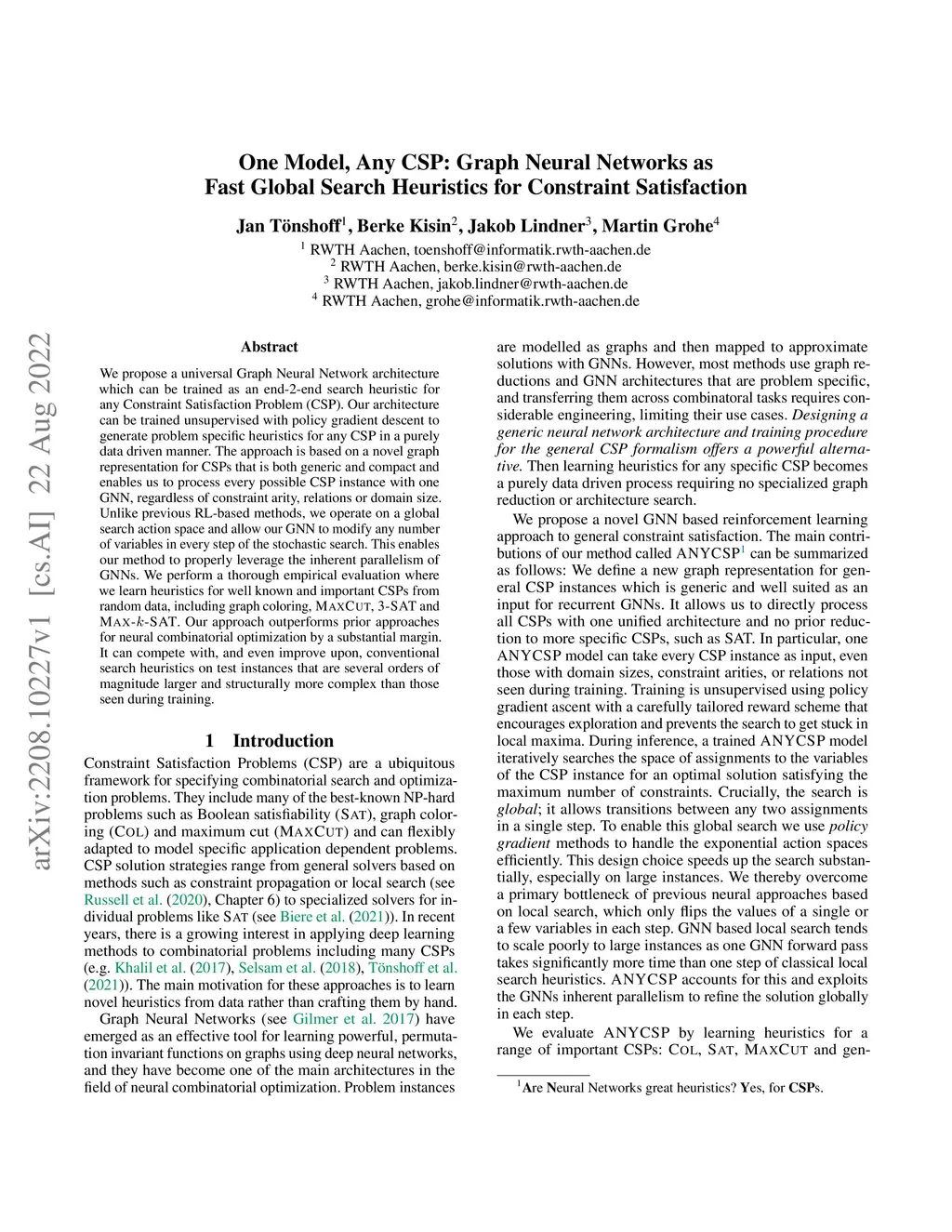 We propose a universal Graph Neural Network architecture which can be trained as an end-2-end search heuristic for any Constraint Satisfaction Problem (CSP). Our architecture can be trained unsupervised with policy gradient descent to generate problem specific heuristics for any CSP in a purely data driven manner. The approach is based on a novel graph representation for CSPs that is both generic and compact and enables us to process every possible CSP instance with one GNN, regardless of constraint arity, relations or domain size. Unlike previous RL-based methods, we operate on a global search action space and allow our GNN to modify any number of variables in every step of the stochastic search. This enables our method to properly leverage the inherent parallelism of GNNs. We perform a thorough empirical evaluation where we learn heuristics for well known and important CSPs from random data, including graph coloring, MaxCut, 3-SAT and MAX-k-SAT. Our approach outperforms prior approaches for neural combinatorial optimization by a substantial margin. It can compete with, and even improve upon, conventional search heuristics on test instances that are several orders of magnitude larger and structurally more complex than those seen during training.