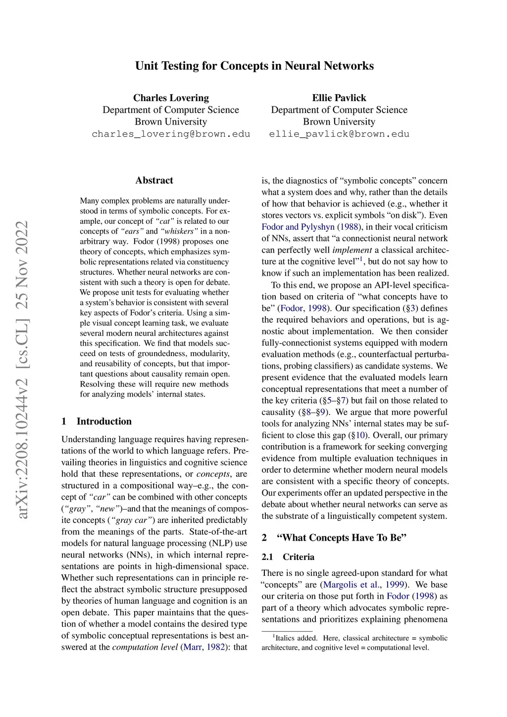 Many complex problems are naturally understood in terms of symbolic concepts. For example, our concept of "cat" is related to our concepts of "ears" and "whiskers" in a non-arbitrary way. Fodor (1998) proposes one theory of concepts, which emphasizes symbolic representations related via constituency structures. Whether neural networks are consistent with such a theory is open for debate. We propose unit tests for evaluating whether a system's behavior is consistent with several key aspects of Fodor's criteria. Using a simple visual concept learning task, we evaluate several modern neural architectures against this specification. We find that models succeed on tests of groundedness, modularlity, and reusability of concepts, but that important questions about causality remain open. Resolving these will require new methods for analyzing models' internal states.