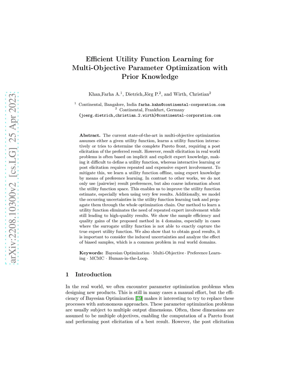 The current state-of-the-art in multi-objective optimization assumes either a given utility function, learns a utility function interactively or tries to determine the complete Pareto front, requiring a post elicitation of the preferred result. However, result elicitation in real world problems is often based on implicit and explicit expert knowledge, making it difficult to define a utility function, whereas interactive learning or post elicitation requires repeated and expensive expert involvement. To mitigate this, we learn a utility function offline, using expert knowledge by means of preference learning. In contrast to other works, we do not only use (pairwise) result preferences, but also coarse information about the utility function space. This enables us to improve the utility function estimate, especially when using very few results. Additionally, we model the occurring uncertainties in the utility function learning task and propagate them through the whole optimization chain. Our method to learn a utility function eliminates the need of repeated expert involvement while still leading to high-quality results. We show the sample efficiency and quality gains of the proposed method in 4 domains, especially in cases where the surrogate utility function is not able to exactly capture the true expert utility function. We also show that to obtain good results, it is important to consider the induced uncertainties and analyze the effect of biased samples, which is a common problem in real world domains.