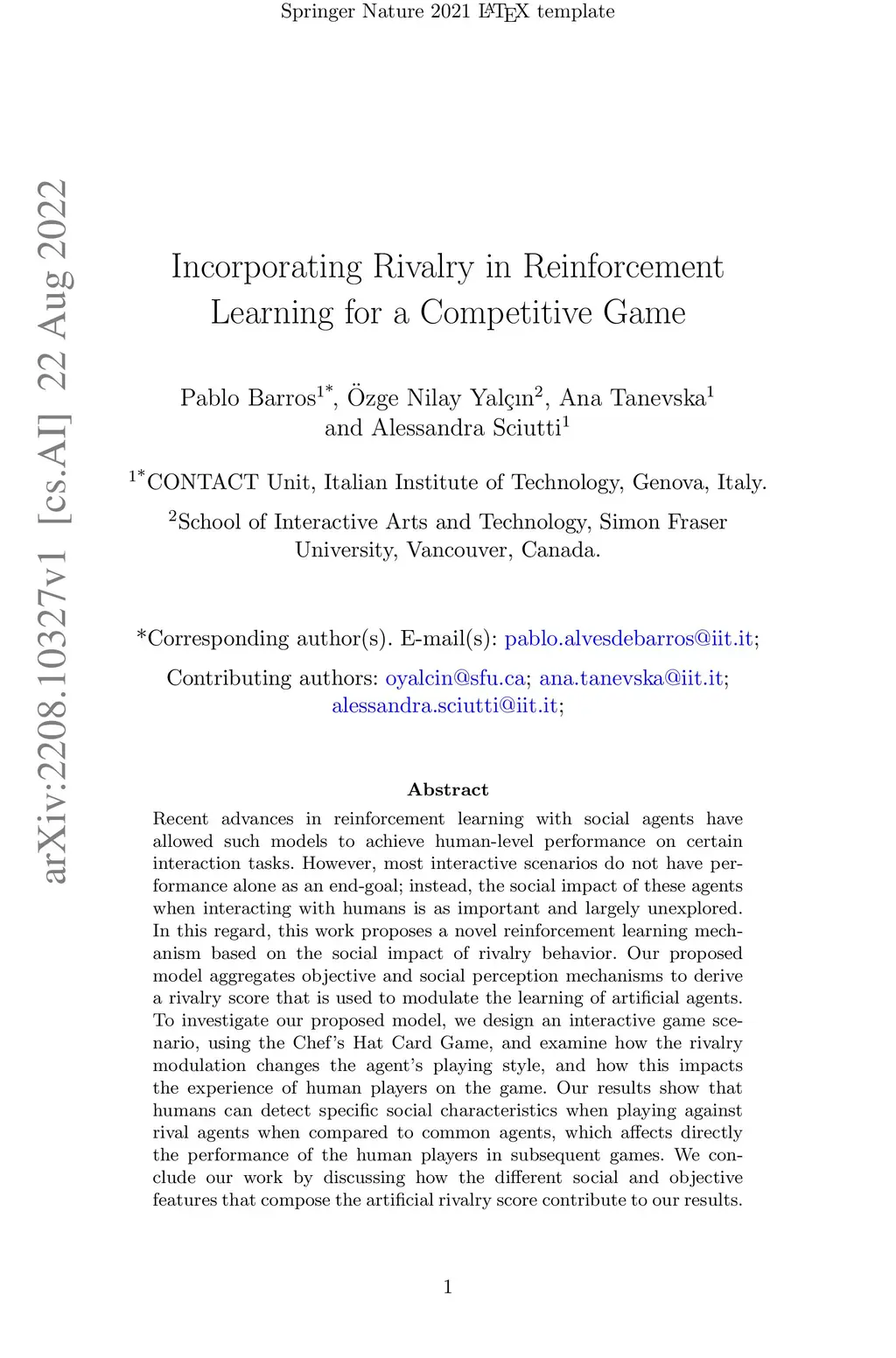 Recent advances in reinforcement learning with social agents have allowed such models to achieve human-level performance on specific interaction tasks. However, most interactive scenarios do not have a version alone as an end goal; instead, the social impact of these agents when interacting with humans is as important and largely unexplored. In this regard, this work proposes a novel reinforcement learning mechanism based on the social impact of rivalry behavior. Our proposed model aggregates objective and social perception mechanisms to derive a rivalry score that is used to modulate the learning of artificial agents. To investigate our proposed model, we design an interactive game scenario, using the Chef's Hat Card Game, and examine how the rivalry modulation changes the agent's playing style, and how this impacts the experience of human players in the game. Our results show that humans can detect specific social characteristics when playing against rival agents when compared to common agents, which directly affects the performance of the human players in subsequent games. We conclude our work by discussing how the different social and objective features that compose the artificial rivalry score contribute to our results.