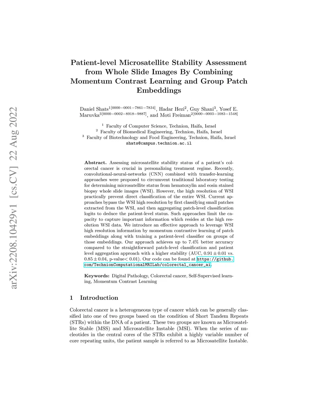Assessing microsatellite stability status of a patient's colorectal cancer is crucial in personalizing treatment regime. Recently, convolutional-neural-networks (CNN) combined with transfer-learning approaches were proposed to circumvent traditional laboratory testing for determining microsatellite status from hematoxylin and eosin stained biopsy whole slide images (WSI). However, the high resolution of WSI practically prevent direct classification of the entire WSI. Current approaches bypass the WSI high resolution by first classifying small patches extracted from the WSI, and then aggregating patch-level classification logits to deduce the patient-level status. Such approaches limit the capacity to capture important information which resides at the high resolution WSI data. We introduce an effective approach to leverage WSI high resolution information by momentum contrastive learning of patch embeddings along with training a patient-level classifier on groups of those embeddings. Our approach achieves up to 7.4\% better accuracy compared to the straightforward patch-level classification and patient level aggregation approach with a higher stability (AUC, vs. , p-value). Our code can be found at https://github.com/TechnionComputationalMRILab/colorectal_cancer_ai.