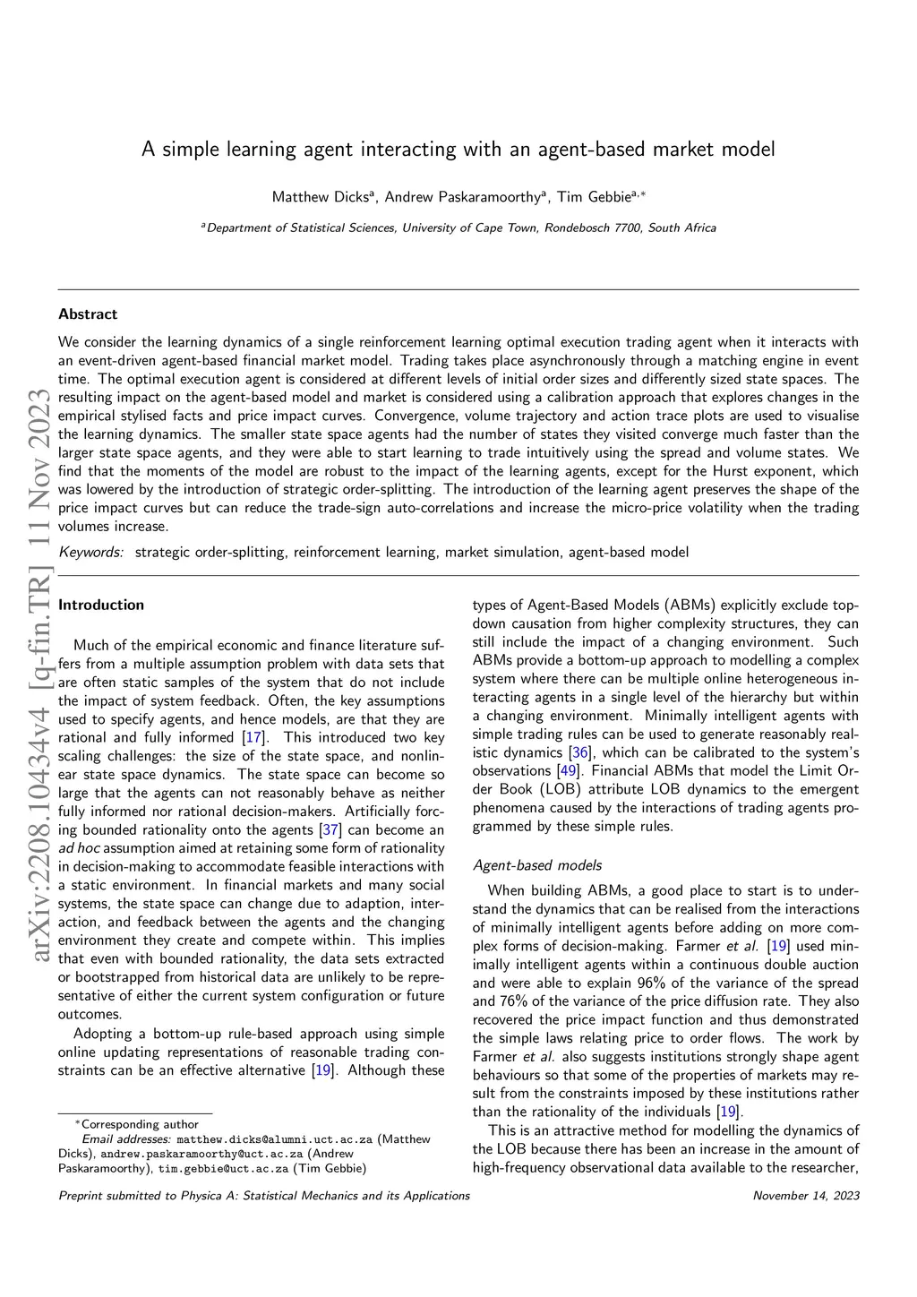 We consider the learning dynamics of a single reinforcement learning optimal execution trading agent when it interacts with an event driven agent-based financial market model. Trading takes place asynchronously through a matching engine in event time. The optimal execution agent is considered at different levels of initial order-sizes and differently sized state spaces. The resulting impact on the agent-based model and market are considered using a calibration approach that explores changes in the empirical stylised facts and price impact curves. Convergence, volume trajectory and action trace plots are used to visualise the learning dynamics. Here the smaller state space agents had the number of states they visited converge much faster than the larger state space agents, and they were able to start learning to trade intuitively using the spread and volume states. We find that the moments of the model are robust to the impact of the learning agents except for the Hurst exponent, which was lowered by the introduction of strategic order-splitting. The introduction of the learning agent preserves the shape of the price impact curves but can reduce the trade-sign auto-correlations when their trading volumes increase.