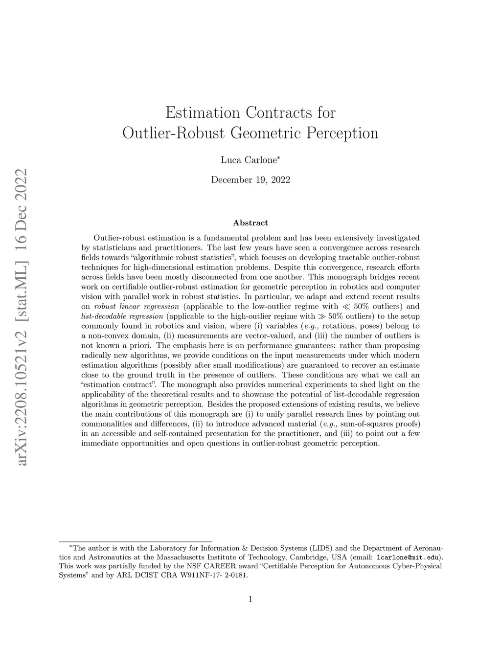 Outlier-robust estimation is a fundamental problem and has been extensively investigated by statisticians and practitioners. The last few years have seen a convergence across research fields towards "algorithmic robust statistics", which focuses on developing tractable outlier-robust techniques for high-dimensional estimation problems. Despite this convergence, research efforts across fields have been mostly disconnected from one another. This monograph bridges recent work on certifiable outlier-robust estimation for geometric perception in robotics and computer vision with parallel work in robust statistics. In particular, we adapt and extend recent results on robust linear regression (applicable to the low-outlier regime with << 50% outliers) and list-decodable regression (applicable to the high-outlier regime with >> 50% outliers) to the setup commonly found in robotics and vision, where (i) variables (e.g., rotations, poses) belong to a non-convex domain, (ii) measurements are vector-valued, and (iii) the number of outliers is not known a priori. The emphasis here is on performance guarantees: rather than proposing radically new algorithms, we provide conditions on the input measurements under which modern estimation algorithms (possibly after small modifications) are guaranteed to recover an estimate close to the ground truth in the presence of outliers. These conditions are what we call an "estimation contract". Besides the proposed extensions of existing results, we believe the main contributions of this monograph are (i) to unify parallel research lines by pointing out commonalities and differences, (ii) to introduce advanced material (e.g., sum-of-squares proofs) in an accessible and self-contained presentation for the practitioner, and (iii) to point out a few immediate opportunities and open questions in outlier-robust geometric perception.