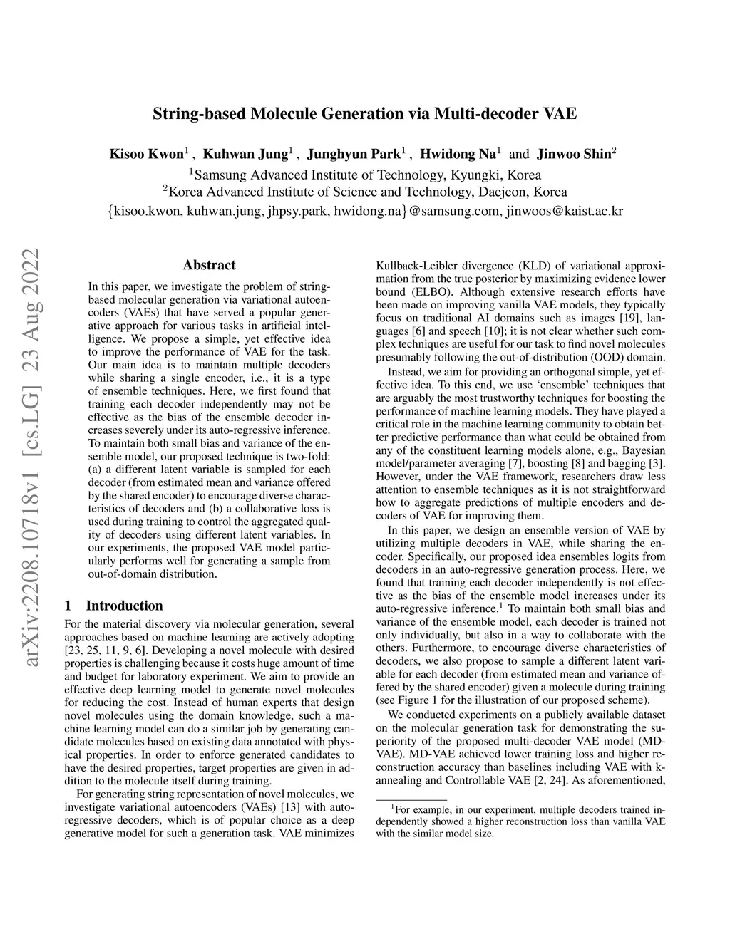 In this paper, we investigate the problem of string-based molecular generation via variational autoencoders (VAEs) that have served a popular generative approach for various tasks in artificial intelligence. We propose a simple, yet effective idea to improve the performance of VAE for the task. Our main idea is to maintain multiple decoders while sharing a single encoder, i.e., it is a type of ensemble techniques. Here, we first found that training each decoder independently may not be effective as the bias of the ensemble decoder increases severely under its auto-regressive inference. To maintain both small bias and variance of the ensemble model, our proposed technique is two-fold: (a) a different latent variable is sampled for each decoder (from estimated mean and variance offered by the shared encoder) to encourage diverse characteristics of decoders and (b) a collaborative loss is used during training to control the aggregated quality of decoders using different latent variables. In our experiments, the proposed VAE model particularly performs well for generating a sample from out-of-domain distribution.