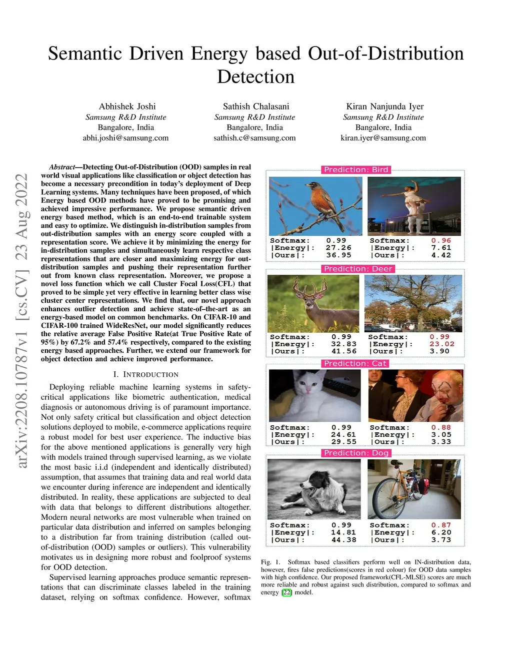 Detecting Out-of-Distribution (OOD) samples in real world visual applications like classification or object detection has become a necessary precondition in today's deployment of Deep Learning systems. Many techniques have been proposed, of which Energy based OOD methods have proved to be promising and achieved impressive performance. We propose semantic driven energy based method, which is an end-to-end trainable system and easy to optimize. We distinguish in-distribution samples from out-distribution samples with an energy score coupled with a representation score. We achieve it by minimizing the energy for in-distribution samples and simultaneously learn respective class representations that are closer and maximizing energy for out-distribution samples and pushing their representation further out from known class representation. Moreover, we propose a novel loss function which we call Cluster Focal Loss(CFL) that proved to be simple yet very effective in learning better class wise cluster center representations. We find that, our novel approach enhances outlier detection and achieve state-of-the-art as an energy-based model on common benchmarks. On CIFAR-10 and CIFAR-100 trained WideResNet, our model significantly reduces the relative average False Positive Rate(at True Positive Rate of 95%) by 67.2% and 57.4% respectively, compared to the existing energy based approaches. Further, we extend our framework for object detection and achieve improved performance.