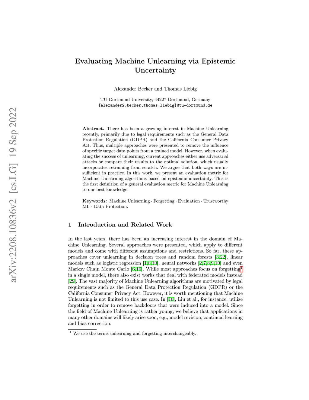 There has been a growing interest in Machine Unlearning recently, primarily due to legal requirements such as the General Data Protection Regulation (GDPR) and the California Consumer Privacy Act. Thus, multiple approaches were presented to remove the influence of specific target data points from a trained model. However, when evaluating the success of unlearning, current approaches either use adversarial attacks or compare their results to the optimal solution, which usually incorporates retraining from scratch. We argue that both ways are insufficient in practice. In this work, we present an evaluation metric for Machine Unlearning algorithms based on epistemic uncertainty. This is the first definition of a general evaluation metric for Machine Unlearning to our best knowledge.