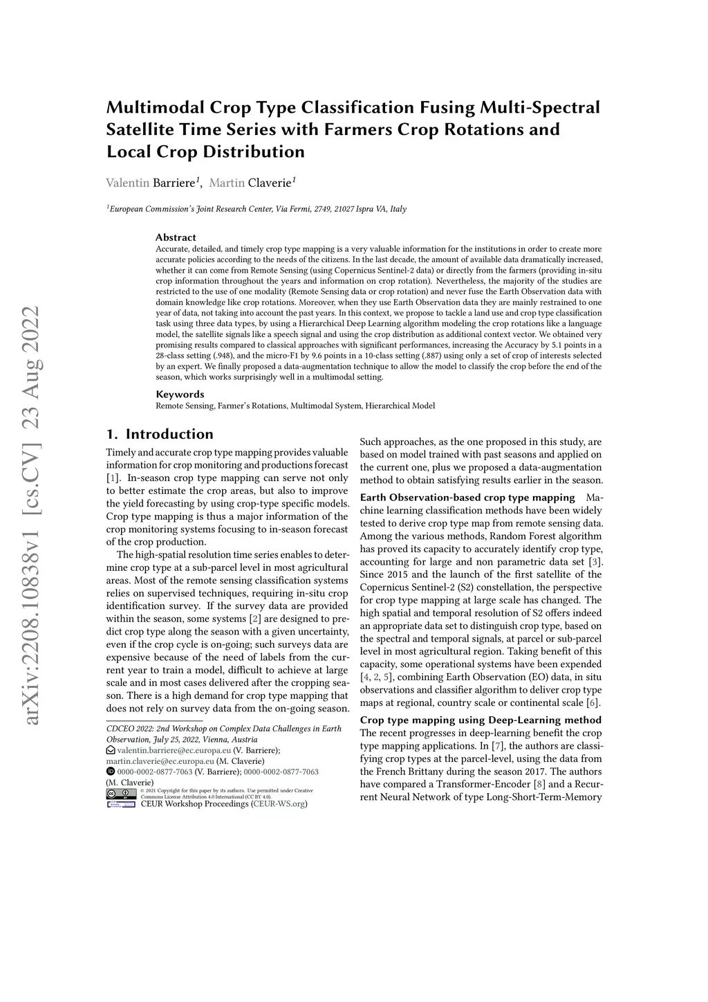 Accurate, detailed, and timely crop type mapping is a very valuable information for the institutions in order to create more accurate policies according to the needs of the citizens. In the last decade, the amount of available data dramatically increased, whether it can come from Remote Sensing (using Copernicus Sentinel-2 data) or directly from the farmers (providing in-situ crop information throughout the years and information on crop rotation). Nevertheless, the majority of the studies are restricted to the use of one modality (Remote Sensing data or crop rotation) and never fuse the Earth Observation data with domain knowledge like crop rotations. Moreover, when they use Earth Observation data they are mainly restrained to one year of data, not taking into account the past years. In this context, we propose to tackle a land use and crop type classification task using three data types, by using a Hierarchical Deep Learning algorithm modeling the crop rotations like a language model, the satellite signals like a speech signal and using the crop distribution as additional context vector. We obtained very promising results compared to classical approaches with significant performances, increasing the Accuracy by 5.1 points in a 28-class setting (.948), and the micro-F1 by 9.6 points in a 10-class setting (.887) using only a set of crop of interests selected by an expert. We finally proposed a data-augmentation technique to allow the model to classify the crop before the end of the season, which works surprisingly well in a multimodal setting.