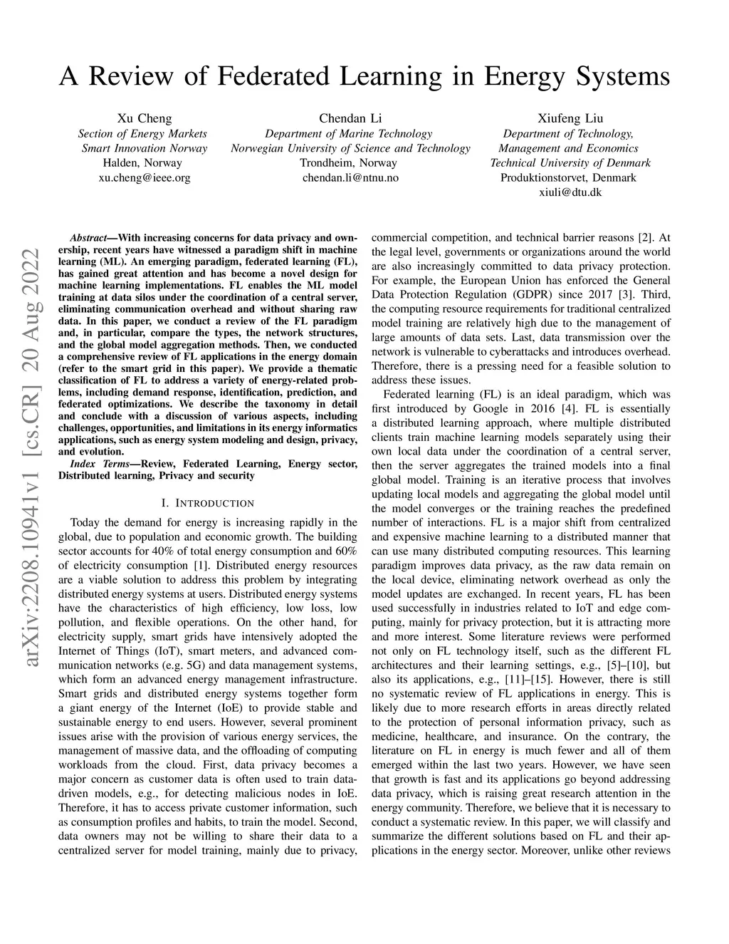 With increasing concerns for data privacy and ownership, recent years have witnessed a paradigm shift in machine learning (ML). An emerging paradigm, federated learning (FL), has gained great attention and has become a novel design for machine learning implementations. FL enables the ML model training at data silos under the coordination of a central server, eliminating communication overhead and without sharing raw data. In this paper, we conduct a review of the FL paradigm and, in particular, compare the types, the network structures, and the global model aggregation methods. Then, we conducted a comprehensive review of FL applications in the energy domain (refer to the smart grid in this paper). We provide a thematic classification of FL to address a variety of energy-related problems, including demand response, identification, prediction, and federated optimizations. We describe the taxonomy in detail and conclude with a discussion of various aspects, including challenges, opportunities, and limitations in its energy informatics applications, such as energy system modeling and design, privacy, and evolution.