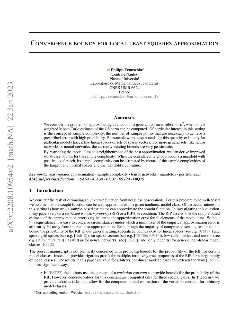 We consider the problem of approximating a function in a general nonlinear subset of , when only a weighted Monte Carlo estimate of the -norm can be computed. Of particular interest in this setting is the concept of sample complexity, the number of sample points that are necessary to achieve a prescribed error with high probability. Reasonable worst-case bounds for this quantity exist only for particular model classes, like linear spaces or sets of sparse vectors. For more general sets, like tensor networks or neural networks, the currently existing bounds are very pessimistic. By restricting the model class to a neighbourhood of the best approximation, we can derive improved worst-case bounds for the sample complexity. When the considered neighbourhood is a manifold with positive local reach, its sample complexity can be estimated by means of the sample complexities of the tangent and normal spaces and the manifold's curvature.