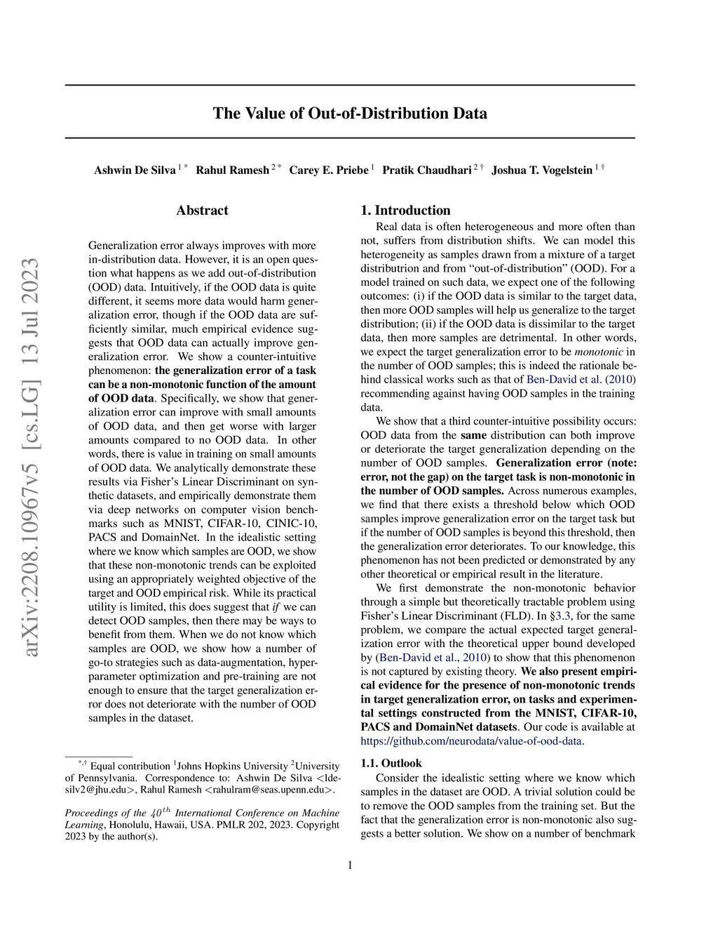We expect the generalization error to improve with more samples from a similar task, and to deteriorate with more samples from an out-of-distribution (OOD) task. In this work, we show a counter-intuitive phenomenon: the generalization error of a task can be a non-monotonic function of the number of OOD samples. As the number of OOD samples increases, the generalization error on the target task improves before deteriorating beyond a threshold. In other words, there is value in training on small amounts of OOD data. We use Fisher's Linear Discriminant on synthetic datasets and deep networks on computer vision benchmarks such as MNIST, CIFAR-10, CINIC-10, PACS and DomainNet to demonstrate and analyze this phenomenon. In the idealistic setting where we know which samples are OOD, we show that these non-monotonic trends can be exploited using an appropriately weighted objective of the target and OOD empirical risk. While its practical utility is limited, this does suggest that if we can detect OOD samples, then there may be ways to benefit from them. When we do not know which samples are OOD, we show how a number of go-to strategies such as data-augmentation, hyper-parameter optimization, and pre-training are not enough to ensure that the target generalization error does not deteriorate with the number of OOD samples in the dataset.
