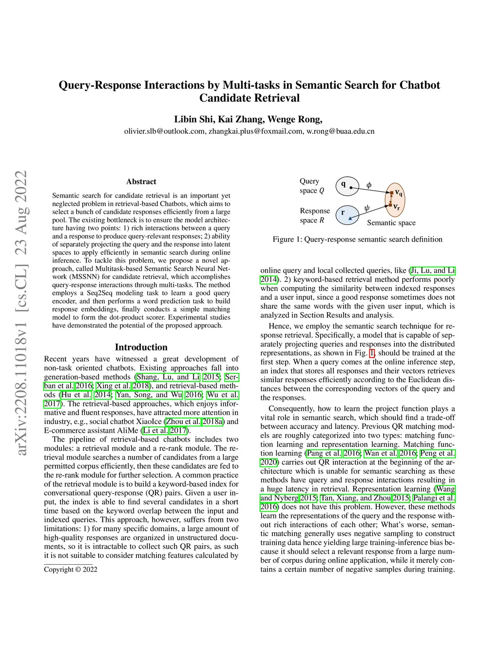 Semantic search for candidate retrieval is an important yet neglected problem in retrieval-based Chatbots, which aims to select a bunch of candidate responses efficiently from a large pool. The existing bottleneck is to ensure the model architecture having two points: 1) rich interactions between a query and a response to produce query-relevant responses; 2) ability of separately projecting the query and the response into latent spaces to apply efficiently in semantic search during online inference. To tackle this problem, we propose a novel approach, called Multitask-based Semantic Search Neural Network (MSSNN) for candidate retrieval, which accomplishes query-response interactions through multi-tasks. The method employs a Seq2Seq modeling task to learn a good query encoder, and then performs a word prediction task to build response embeddings, finally conducts a simple matching model to form the dot-product scorer. Experimental studies have demonstrated the potential of the proposed approach.