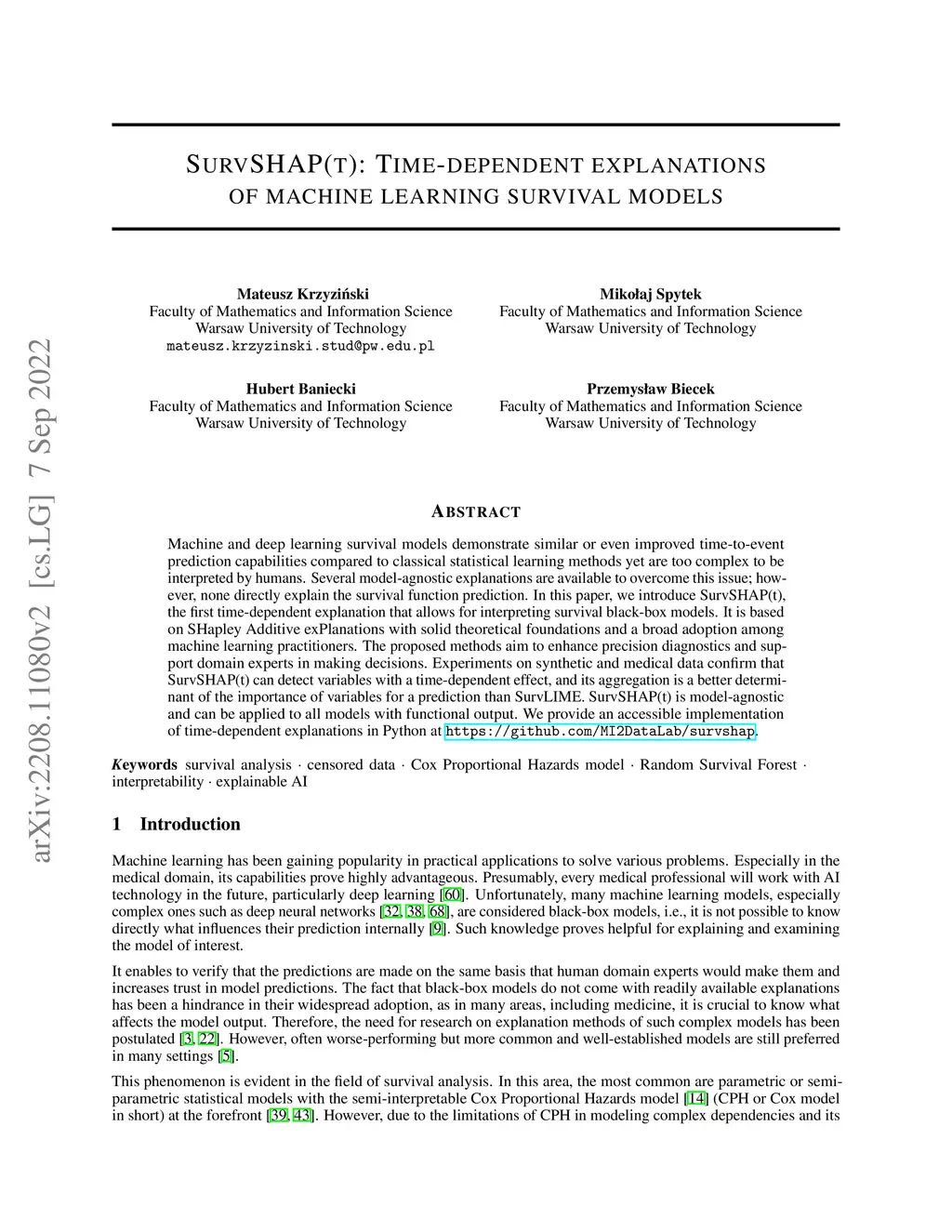 Machine and deep learning survival models demonstrate similar or even improved time-to-event prediction capabilities compared to classical statistical learning methods yet are too complex to be interpreted by humans. Several model-agnostic explanations are available to overcome this issue; however, none directly explain the survival function prediction. In this paper, we introduce SurvSHAP(t), the first time-dependent explanation that allows for interpreting survival black-box models. It is based on SHapley Additive exPlanations with solid theoretical foundations and a broad adoption among machine learning practitioners. The proposed methods aim to enhance precision diagnostics and support domain experts in making decisions. Experiments on synthetic and medical data confirm that SurvSHAP(t) can detect variables with a time-dependent effect, and its aggregation is a better determinant of the importance of variables for a prediction than SurvLIME. SurvSHAP(t) is model-agnostic and can be applied to all models with functional output. We provide an accessible implementation of time-dependent explanations in Python at http://github.com/MI2DataLab/survshap.