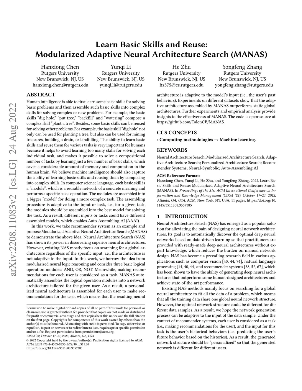 Human intelligence is able to first learn some basic skills for solving basic problems and then assemble such basic skills into complex skills for solving complex or new problems. For example, the basic skills "dig hole," "put tree," "backfill" and "watering" compose a complex skill "plant a tree". Besides, some basic skills can be reused for solving other problems. For example, the basic skill "dig hole" not only can be used for planting a tree, but also can be used for mining treasures, building a drain, or landfilling. The ability to learn basic skills and reuse them for various tasks is very important for humans because it helps to avoid learning too many skills for solving each individual task, and makes it possible to solve a compositional number of tasks by learning just a few number of basic skills, which saves a considerable amount of memory and computation in the human brain. We believe that machine intelligence should also capture the ability of learning basic skills and reusing them by composing into complex skills. In computer science language, each basic skill is a "module", which is a reusable network of a concrete meaning and performs a specific basic operation. The modules are assembled into a bigger "model" for doing a more complex task. The assembling procedure is adaptive to the input or task, i.e., for a given task, the modules should be assembled into the best model for solving the task. As a result, different inputs or tasks could have different assembled models, which enables Auto-Assembling AI (AAAI). In this work, we propose Modularized Adaptive Neural Architecture Search (MANAS) to demonstrate the above idea. Experiments on different datasets show that the adaptive architecture assembled by MANAS outperforms static global architectures. Further experiments and empirical analysis provide insights to the effectiveness of MANAS.