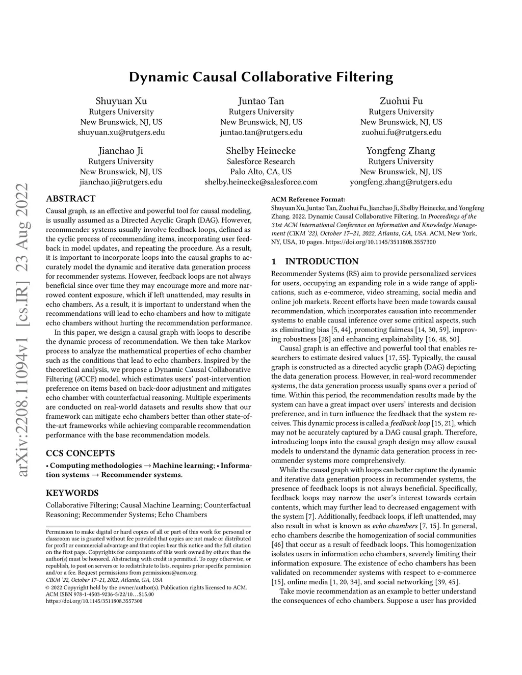 Causal graph, as an effective and powerful tool for causal modeling, is usually assumed as a Directed Acyclic Graph (DAG). However, recommender systems usually involve feedback loops, defined as the cyclic process of recommending items, incorporating user feedback in model updates, and repeating the procedure. As a result, it is important to incorporate loops into the causal graphs to accurately model the dynamic and iterative data generation process for recommender systems. However, feedback loops are not always beneficial since over time they may encourage more and more narrowed content exposure, which if left unattended, may results in echo chambers. As a result, it is important to understand when the recommendations will lead to echo chambers and how to mitigate echo chambers without hurting the recommendation performance. In this paper, we design a causal graph with loops to describe the dynamic process of recommendation. We then take Markov process to analyze the mathematical properties of echo chamber such as the conditions that lead to echo chambers. Inspired by the theoretical analysis, we propose a Dynamic Causal Collaborative Filtering (CCF) model, which estimates users' post-intervention preference on items based on back-door adjustment and mitigates echo chamber with counterfactual reasoning. Multiple experiments are conducted on real-world datasets and results show that our framework can mitigate echo chambers better than other state-of-the-art frameworks while achieving comparable recommendation performance with the base recommendation models.