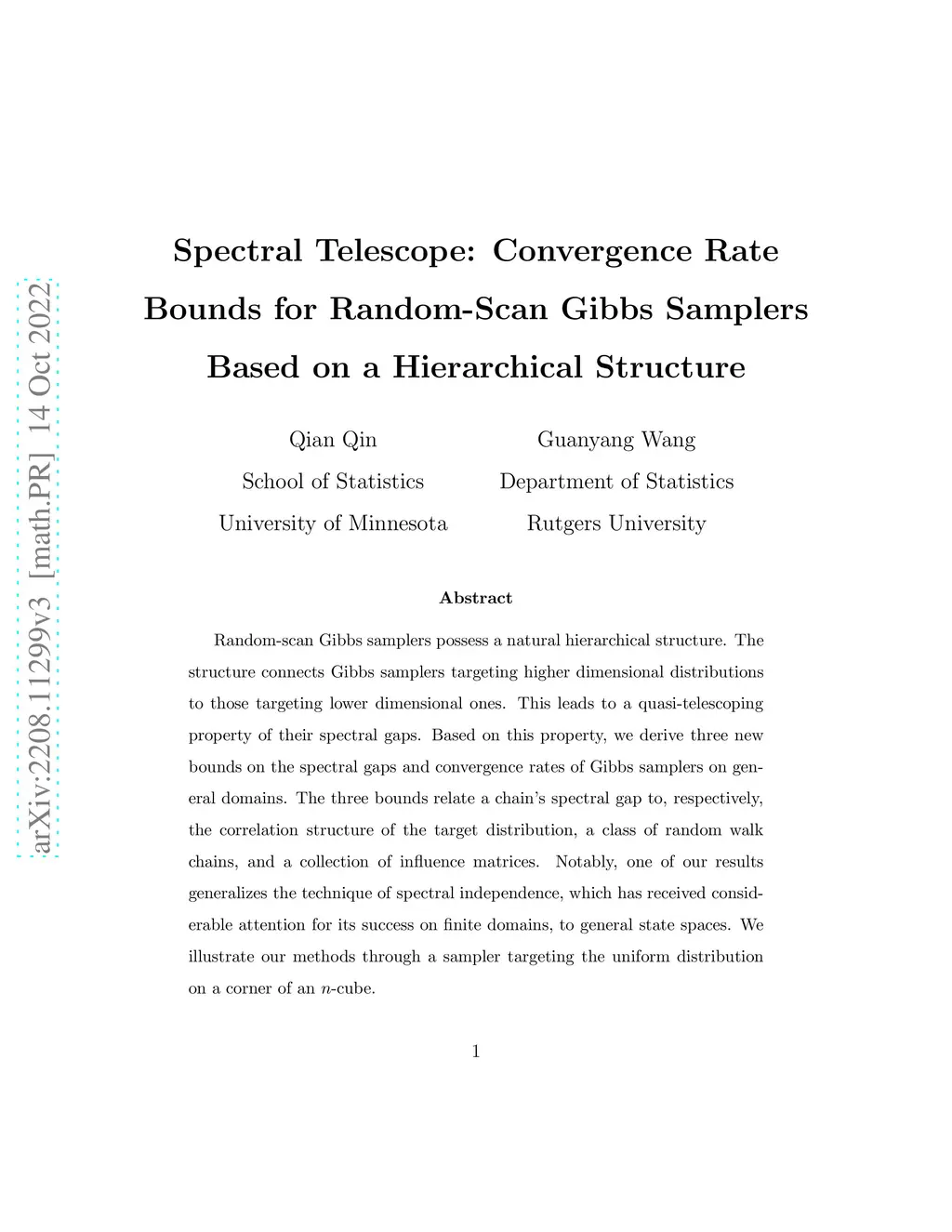 Random-scan Gibbs samplers possess a natural hierarchical structure. The structure connects Gibbs samplers targeting higher dimensional distributions to those targeting lower dimensional ones. This leads to a quasi-telescoping property of their spectral gaps. Based on this property, we derive three new bounds on the spectral gaps and convergence rates of Gibbs samplers on general domains. The three bounds relate a chain's spectral gap to, respectively, the correlation structure of the target distribution, a class of random walk chains, and a collection of influence matrices. Notably, one of our results generalizes the technique of spectral independence, which has received considerable attention for its success on finite domains, to general state spaces. We illustrate our methods through a sampler targeting the uniform distribution on a corner of an -cube.
