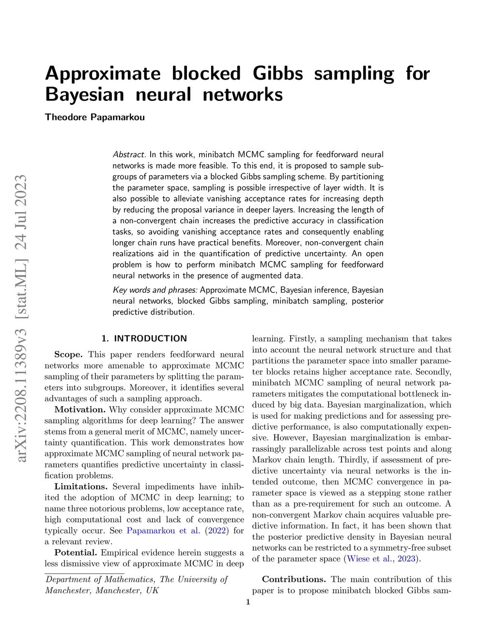 In this work, minibatch MCMC sampling for feedforward neural networks is made more feasible. To this end, it is proposed to sample subgroups of parameters via a blocked Gibbs sampling scheme. By partitioning the parameter space, sampling is possible irrespective of layer width. It is also possible to alleviate vanishing acceptance rates for increasing depth by reducing the proposal variance in deeper layers. Increasing the length of a non-convergent chain increases the predictive accuracy in classification tasks, so avoiding vanishing acceptance rates and consequently enabling longer chain runs have practical benefits. Moreover, non-convergent chain realizations aid in the quantification of predictive uncertainty. An open problem is how to perform minibatch MCMC sampling for feedforward neural networks in the presence of augmented data.