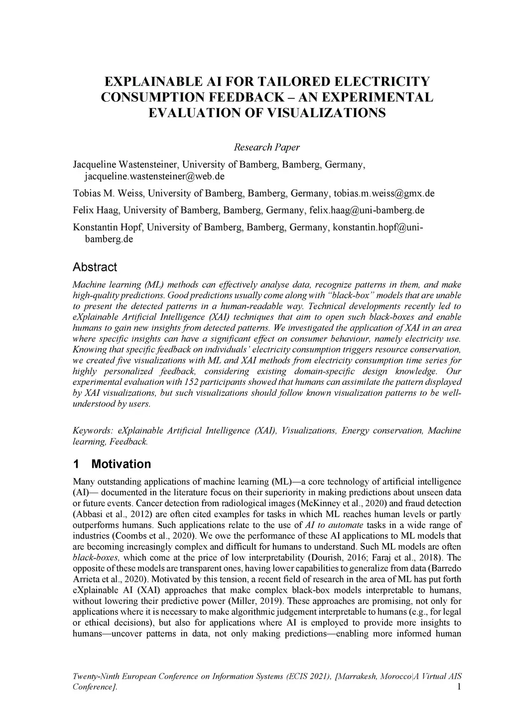 Machine learning (ML) methods can effectively analyse data, recognize patterns in them, and make high-quality predictions. Good predictions usually come along with "black-box" models that are unable to present the detected patterns in a human-readable way. Technical developments recently led to eXplainable Artificial Intelligence (XAI) techniques that aim to open such black-boxes and enable humans to gain new insights from detected patterns. We investigated the application of XAI in an area where specific insights can have a significant effect on consumer behaviour, namely electricity use. Knowing that specific feedback on individuals' electricity consumption triggers resource conservation, we created five visualizations with ML and XAI methods from electricity consumption time series for highly personalized feedback, considering existing domain-specific design knowledge. Our experimental evaluation with 152 participants showed that humans can assimilate the pattern displayed by XAI visualizations, but such visualizations should follow known visualization patterns to be well-understood by users.