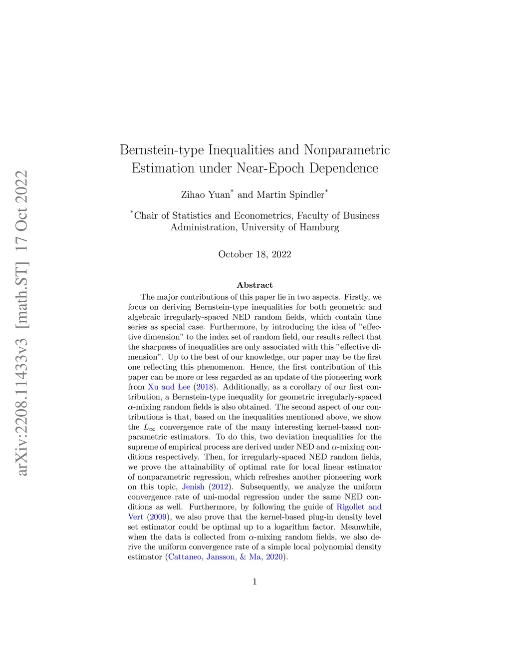 The major contributions of this paper lie in two aspects. Firstly, we focus on deriving Bernstein-type inequalities for both geometric and algebraic irregularly-spaced NED random fields, which contain time series as special case. Furthermore, by introducing the idea of "effective dimension" to the index set of random field, our results reflect that the sharpness of inequalities are only associated with this "effective dimension". Up to the best of our knowledge, our paper may be the first one reflecting this phenomenon. Hence, the first contribution of this paper can be more or less regarded as an update of the pioneering work from \citeA{xu2018sieve}. Additionally, as a corollary of our first contribution, a Bernstein-type inequality for geometric irregularly-spaced -mixing random fields is also obtained. The second aspect of our contributions is that, based on the inequalities mentioned above, we show the convergence rate of the many interesting kernel-based nonparametric estimators. To do this, two deviation inequalities for the supreme of empirical process are derived under NED and -mixing conditions respectively. Then, for irregularly-spaced NED random fields, we prove the attainability of optimal rate for local linear estimator of nonparametric regression, which refreshes another pioneering work on this topic, \citeA{jenish2012nonparametric}. Subsequently, we analyze the uniform convergence rate of uni-modal regression under the same NED conditions as well. Furthermore, by following the guide of \citeA{rigollet2009optimal}, we also prove that the kernel-based plug-in density level set estimator could be optimal up to a logarithm factor. Meanwhile, when the data is collected from -mixing random fields, we also derive the uniform convergence rate of a simple local polynomial density estimator \cite{cattaneo2020simple}.
