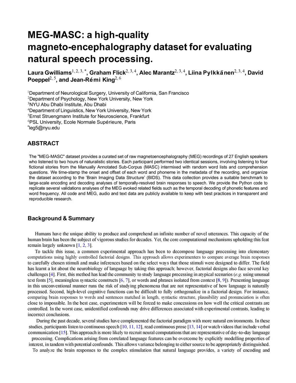 MEG-MASC: a high-quality magneto-encephalography dataset for evaluating
