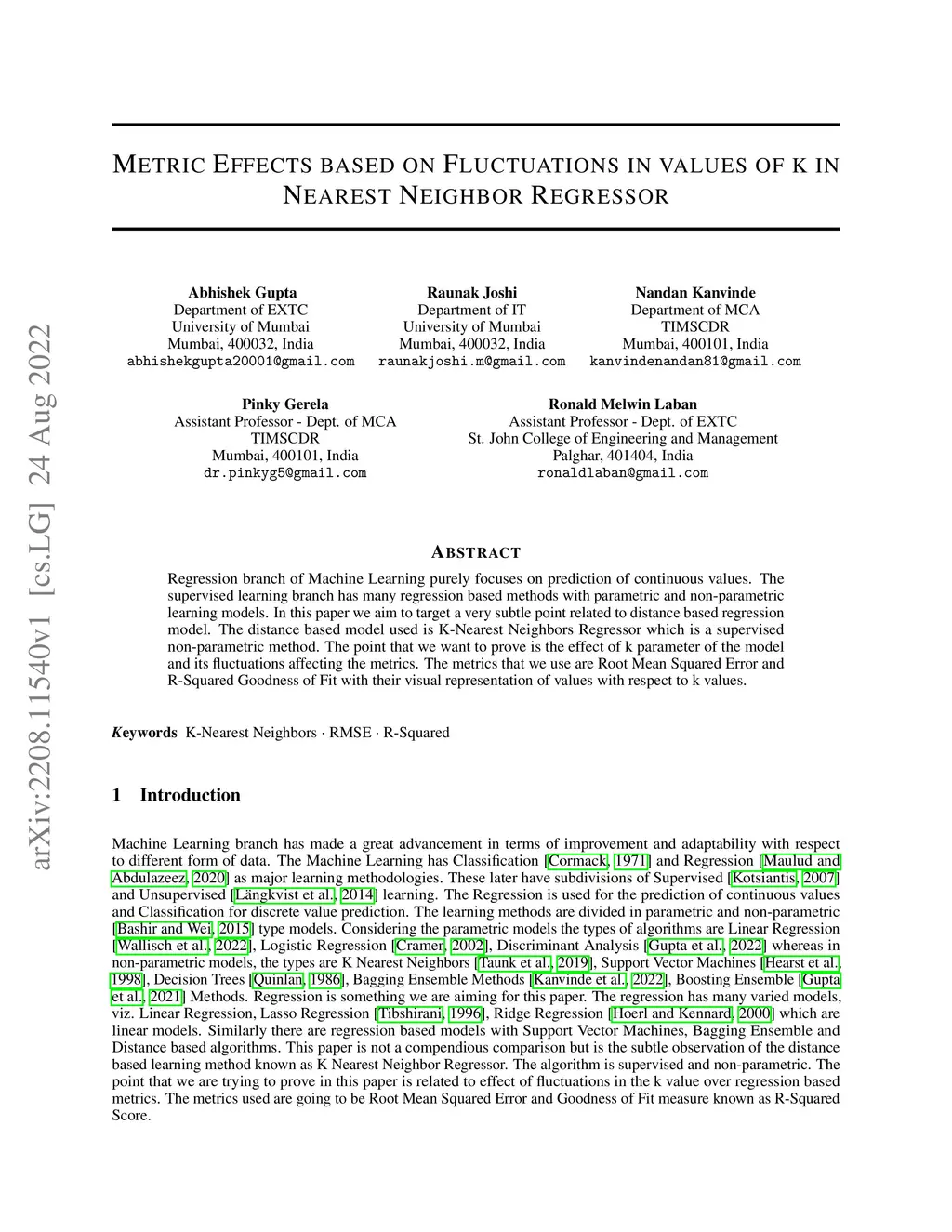 Regression branch of Machine Learning purely focuses on prediction of continuous values. The supervised learning branch has many regression based methods with parametric and non-parametric learning models. In this paper we aim to target a very subtle point related to distance based regression model. The distance based model used is K-Nearest Neighbors Regressor which is a supervised non-parametric method. The point that we want to prove is the effect of k parameter of the model and its fluctuations affecting the metrics. The metrics that we use are Root Mean Squared Error and R-Squared Goodness of Fit with their visual representation of values with respect to k values.