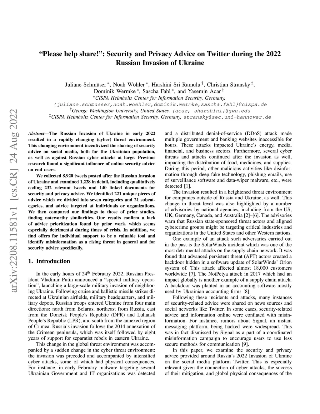 The Russian Invasion of Ukraine in early 2022 resulted in a rapidly changing (cyber) threat environment. This changing environment incentivized the sharing of security advice on social media, both for the Ukrainian population, as well as against Russian cyber attacks at large. Previous research found a significant influence of online security advice on end users. We collected 8,920 tweets posted after the Russian Invasion of Ukraine and examined 1,228 in detail, including qualitatively coding 232 relevant tweets and 140 linked documents for security and privacy advice. We identified 221 unique pieces of advice which we divided into seven categories and 21 subcategories, and advice targeted at individuals or organizations. We then compared our findings to those of prior studies, finding noteworthy similarities. Our results confirm a lack of advice prioritization found by prior work, which seems especially detrimental during times of crisis. In addition, we find offers for individual support to be a valuable tool and identify misinformation as a rising threat in general and for security advice specifically.