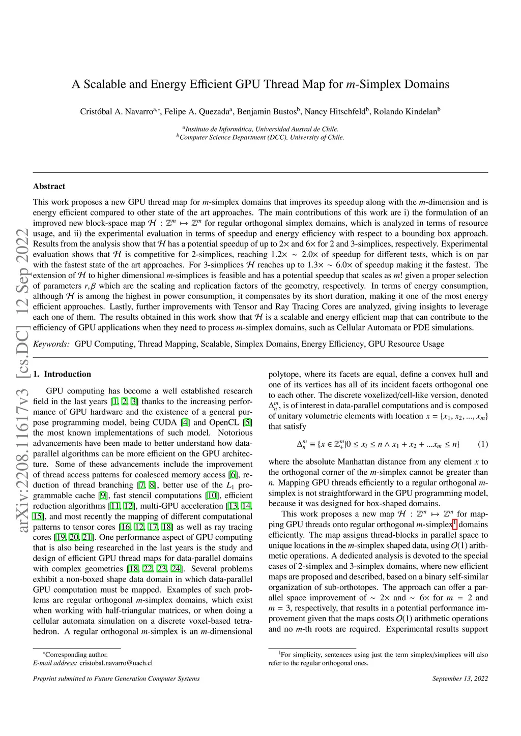 This work proposes a new GPU thread map for -simplex domains, that scales its speedup with dimension and is energy efficient compared to other state of the art approaches. The main contributions of this work are i) the formulation of the new block-space map for regular orthogonal simplex domains, which is analyzed in terms of resource usage, and ii) the experimental evaluation in terms of speedup over a bounding box approach and energy efficiency as elements per second per Watt. Results from the analysis show that has a potential speedup of up to and for and -simplices, respectively. Experimental evaluation shows that is competitive for -simplices, reaching of speedup for different tests, which is on par with the fastest state of the art approaches. For -simplices reaches up to of speedup making it the fastest of all. The extension of to higher dimensional -simplices is feasible and has a potential speedup that scales as given a proper selection of parameters which are the scaling and replication factors, respectively. In terms of energy consumption, although is among the highest in power consumption, it compensates by its short duration, making it one of the most energy efficient approaches. Lastly, further improvements with Tensor and Ray Tracing Cores are analyzed, giving insights to leverage each one of them. The results obtained in this work show that is a scalable and energy efficient map that can contribute to the efficiency of GPU applications when they need to process -simplex domains, such as Cellular Automata or PDE simulations.