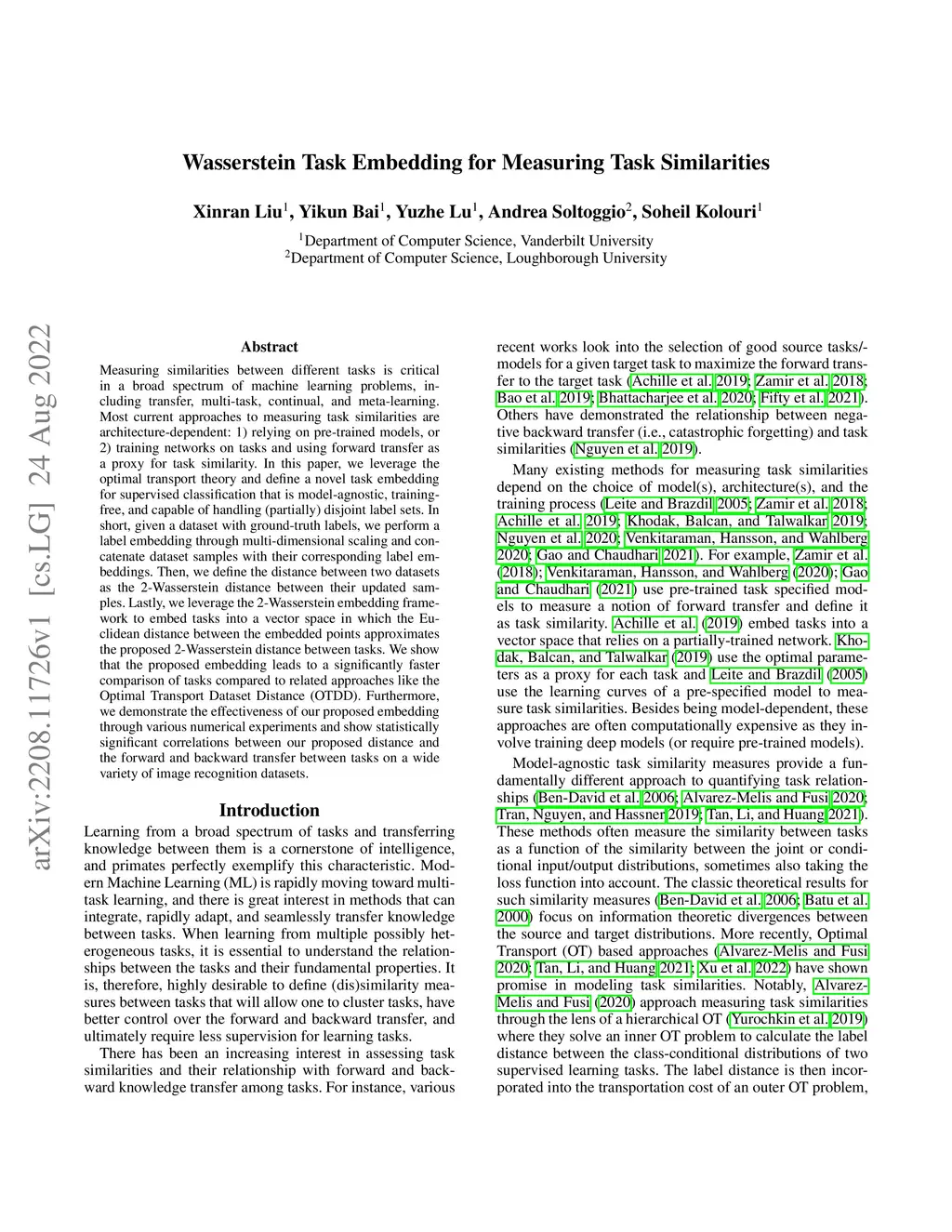 Measuring similarities between different tasks is critical in a broad spectrum of machine learning problems, including transfer, multi-task, continual, and meta-learning. Most current approaches to measuring task similarities are architecture-dependent: 1) relying on pre-trained models, or 2) training networks on tasks and using forward transfer as a proxy for task similarity. In this paper, we leverage the optimal transport theory and define a novel task embedding for supervised classification that is model-agnostic, training-free, and capable of handling (partially) disjoint label sets. In short, given a dataset with ground-truth labels, we perform a label embedding through multi-dimensional scaling and concatenate dataset samples with their corresponding label embeddings. Then, we define the distance between two datasets as the 2-Wasserstein distance between their updated samples. Lastly, we leverage the 2-Wasserstein embedding framework to embed tasks into a vector space in which the Euclidean distance between the embedded points approximates the proposed 2-Wasserstein distance between tasks. We show that the proposed embedding leads to a significantly faster comparison of tasks compared to related approaches like the Optimal Transport Dataset Distance (OTDD). Furthermore, we demonstrate the effectiveness of our proposed embedding through various numerical experiments and show statistically significant correlations between our proposed distance and the forward and backward transfer between tasks.