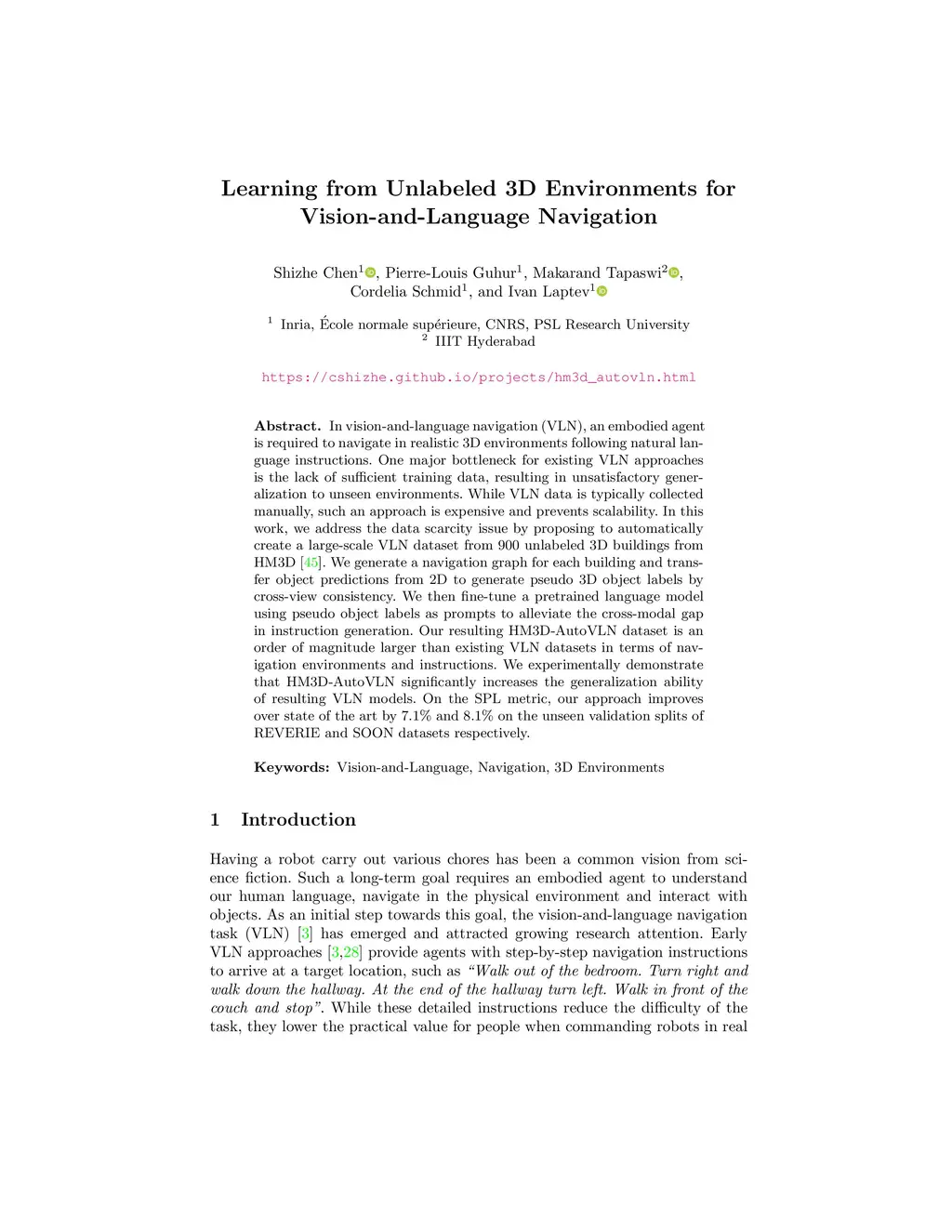 In vision-and-language navigation (VLN), an embodied agent is required to navigate in realistic 3D environments following natural language instructions. One major bottleneck for existing VLN approaches is the lack of sufficient training data, resulting in unsatisfactory generalization to unseen environments. While VLN data is typically collected manually, such an approach is expensive and prevents scalability. In this work, we address the data scarcity issue by proposing to automatically create a large-scale VLN dataset from 900 unlabeled 3D buildings from HM3D. We generate a navigation graph for each building and transfer object predictions from 2D to generate pseudo 3D object labels by cross-view consistency. We then fine-tune a pretrained language model using pseudo object labels as prompts to alleviate the cross-modal gap in instruction generation. Our resulting HM3D-AutoVLN dataset is an order of magnitude larger than existing VLN datasets in terms of navigation environments and instructions. We experimentally demonstrate that HM3D-AutoVLN significantly increases the generalization ability of resulting VLN models. On the SPL metric, our approach improves over state of the art by 7.1% and 8.1% on the unseen validation splits of REVERIE and SOON datasets respectively.