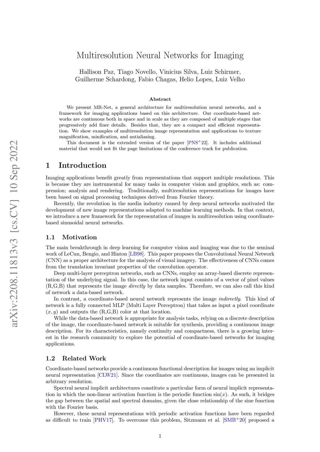 We present MR-Net, a general architecture for multiresolution neural networks, and a framework for imaging applications based on this architecture. Our coordinate-based networks are continuous both in space and in scale as they are composed of multiple stages that progressively add finer details. Besides that, they are a compact and efficient representation. We show examples of multiresolution image representation and applications to texturemagnification, minification, and antialiasing. This document is the extended version of the paper [PNS+22]. It includes additional material that would not fit the page limitations of the conference track for publication.