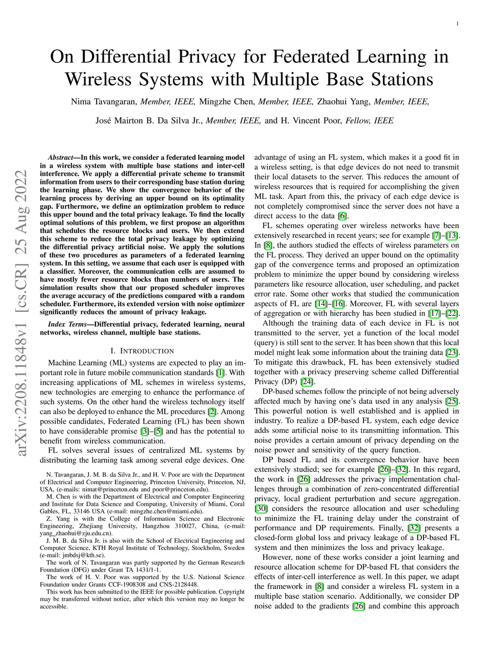 In this work, we consider a federated learning model in a wireless system with multiple base stations and inter-cell interference. We apply a differential private scheme to transmit information from users to their corresponding base station during the learning phase. We show the convergence behavior of the learning process by deriving an upper bound on its optimality gap. Furthermore, we define an optimization problem to reduce this upper bound and the total privacy leakage. To find the locally optimal solutions of this problem, we first propose an algorithm that schedules the resource blocks and users. We then extend this scheme to reduce the total privacy leakage by optimizing the differential privacy artificial noise. We apply the solutions of these two procedures as parameters of a federated learning system. In this setting, we assume that each user is equipped with a classifier. Moreover, the communication cells are assumed to have mostly fewer resource blocks than numbers of users. The simulation results show that our proposed scheduler improves the average accuracy of the predictions compared with a random scheduler. Furthermore, its extended version with noise optimizer significantly reduces the amount of privacy leakage.