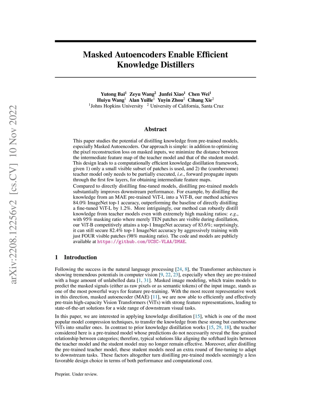 This paper studies the potential of distilling knowledge from pre-trained models, especially Masked Autoencoders. Our approach is simple: in addition to optimizing the pixel reconstruction loss on masked inputs, we minimize the distance between the intermediate feature map of the teacher model and that of the student model. This design leads to a computationally efficient knowledge distillation framework, given 1) only a small visible subset of patches is used, and 2) the (cumbersome) teacher model only needs to be partially executed, ie, forward propagate inputs through the first few layers, for obtaining intermediate feature maps. Compared to directly distilling fine-tuned models, distilling pre-trained models substantially improves downstream performance. For example, by distilling the knowledge from an MAE pre-trained ViT-L into a ViT-B, our method achieves 84.0% ImageNet top-1 accuracy, outperforming the baseline of directly distilling a fine-tuned ViT-L by 1.2%. More intriguingly, our method can robustly distill knowledge from teacher models even with extremely high masking ratios: e.g., with 95% masking ratio where merely TEN patches are visible during distillation, our ViT-B competitively attains a top-1 ImageNet accuracy of 83.6%; surprisingly, it can still secure 82.4% top-1 ImageNet accuracy by aggressively training with just FOUR visible patches (98% masking ratio). The code and models are publicly available at https://github.com/UCSC-VLAA/DMAE.