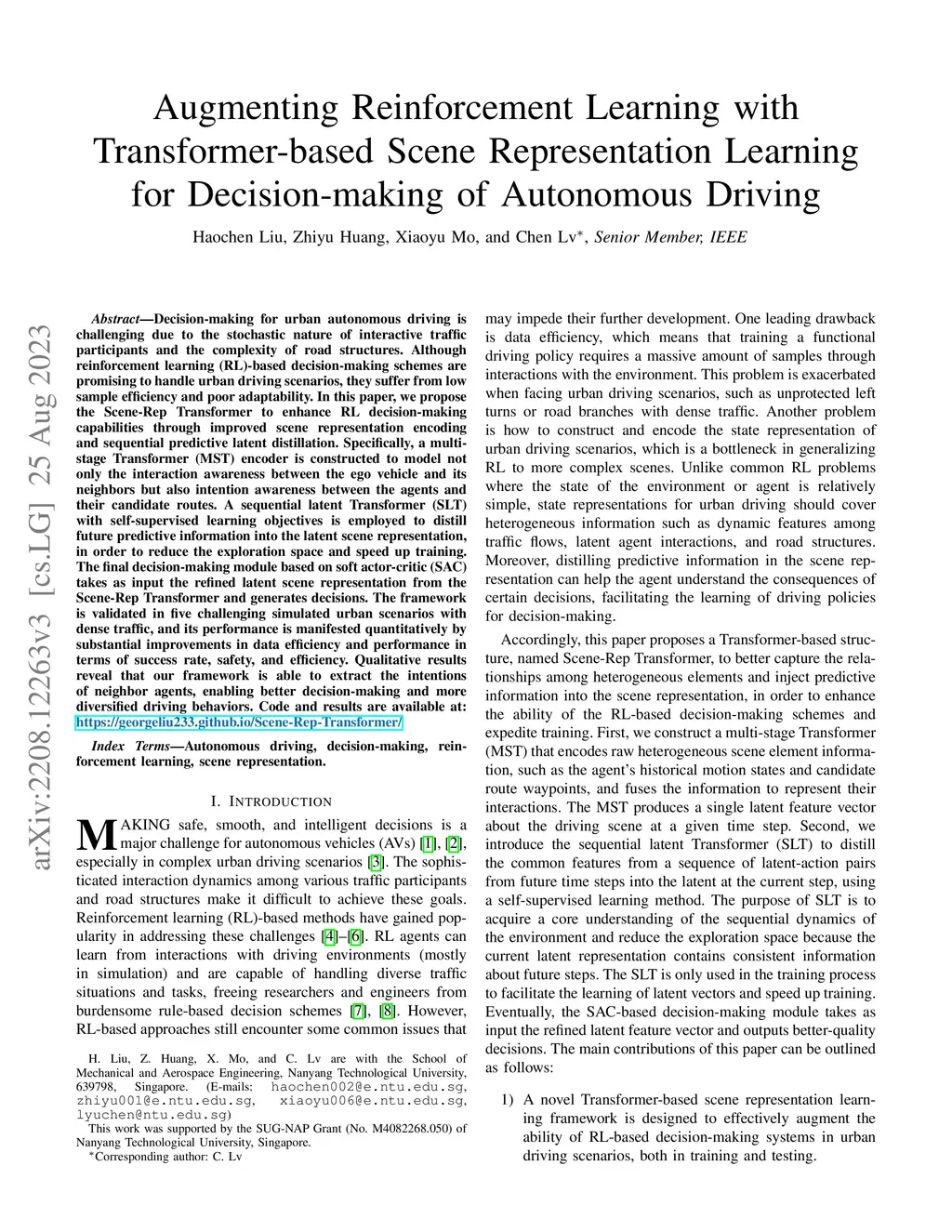 Decision-making for urban autonomous driving is challenging due to the stochastic nature of interactive traffic participants and the complexity of road structures. Although reinforcement learning (RL)-based decision-making scheme is promising to handle urban driving scenarios, it suffers from low sample efficiency and poor adaptability. In this paper, we propose Scene-Rep Transformer to improve the RL decision-making capabilities with better scene representation encoding and sequential predictive latent distillation. Specifically, a multi-stage Transformer (MST) encoder is constructed to model not only the interaction awareness between the ego vehicle and its neighbors but also intention awareness between the agents and their candidate routes. A sequential latent Transformer (SLT) with self-supervised learning objectives is employed to distill the future predictive information into the latent scene representation, in order to reduce the exploration space and speed up training. The final decision-making module based on soft actor-critic (SAC) takes as input the refined latent scene representation from the Scene-Rep Transformer and outputs driving actions. The framework is validated in five challenging simulated urban scenarios with dense traffic, and its performance is manifested quantitatively by the substantial improvements in data efficiency and performance in terms of success rate, safety, and efficiency. The qualitative results reveal that our framework is able to extract the intentions of neighbor agents to help make decisions and deliver more diversified driving behaviors.