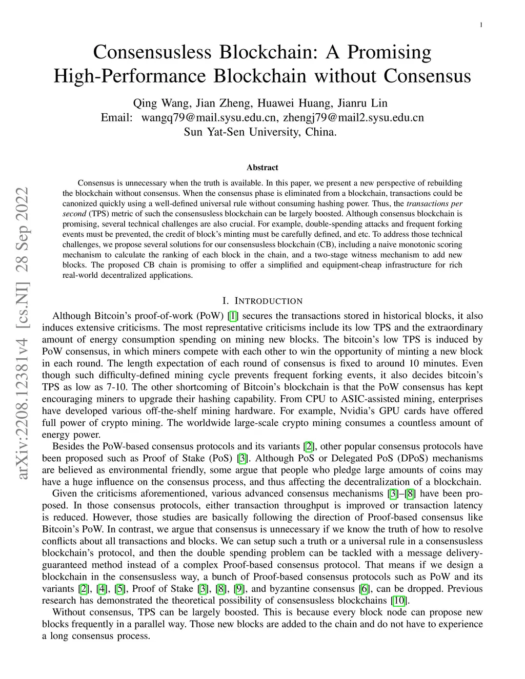 Consensus is unnecessary when the truth is available. In this paper, we present a new perspective of rebuilding the blockchain without consensus. When the consensus phase is eliminated from a blockchain, transactions could be canonized quickly using a well-defined universal rule without consuming hashing power. Thus, the transactions per second(TPS) metric of such the consensusless blockchain can be largely boosted. Although consensus blockchain is promising, several technical challenges are also crucial. For example, double-spending attacks and frequent forking events must be prevented, the credit of block's minting must be carefully defined, and etc. To address those technical challenges, we propose several solutions for our consensusless blockchain (CB), including a naive monotonic scoring mechanism to calculate the ranking of each block in the chain, and a two-stage witness mechanism to add new blocks. The proposed CB chain is promising to offer a simplified and equipment-cheap infrastructure for rich real-world decentralized applications.