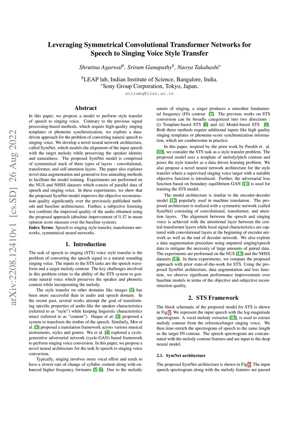 In this paper, we propose a model to perform style transfer of speech to singing voice. Contrary to the previous signal processing-based methods, which require high-quality singing templates or phoneme synchronization, we explore a data-driven approach for the problem of converting natural speech to singing voice. We develop a novel neural network architecture, called SymNet, which models the alignment of the input speech with the target melody while preserving the speaker identity and naturalness. The proposed SymNet model is comprised of symmetrical stack of three types of layers - convolutional, transformer, and self-attention layers. The paper also explores novel data augmentation and generative loss annealing methods to facilitate the model training. Experiments are performed on the NUS and NHSS datasets which consist of parallel data of speech and singing voice. In these experiments, we show that the proposed SymNet model improves the objective reconstruction quality significantly over the previously published methods and baseline architectures. Further, a subjective listening test confirms the improved quality of the audio obtained using the proposed approach (absolute improvement of 0.37 in mean opinion score measure over the baseline system).