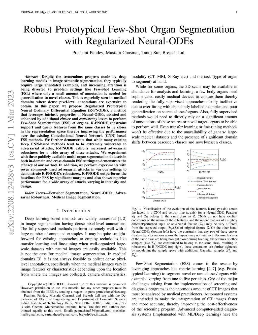 Despite the tremendous progress made by deep learning models in image semantic segmentation, they typically require large annotated examples, and increasing attention is being diverted to problem settings like Few-Shot Learning (FSL) where only a small amount of annotation is needed for generalisation to novel classes. This is especially seen in medical domains where dense pixel-level annotations are expensive to obtain. In this paper, we propose Regularized Prototypical Neural Ordinary Differential Equation (R-PNODE), a method that leverages intrinsic properties of Neural-ODEs, assisted and enhanced by additional cluster and consistency losses to perform Few-Shot Segmentation (FSS) of organs. R-PNODE constrains support and query features from the same classes to lie closer in the representation space thereby improving the performance over the existing Convolutional Neural Network (CNN) based FSS methods. We further demonstrate that while many existing Deep CNN based methods tend to be extremely vulnerable to adversarial attacks, R-PNODE exhibits increased adversarial robustness for a wide array of these attacks. We experiment with three publicly available multi-organ segmentation datasets in both in-domain and cross-domain FSS settings to demonstrate the efficacy of our method. In addition, we perform experiments with seven commonly used adversarial attacks in various settings to demonstrate R-PNODE's robustness. R-PNODE outperforms the baselines for FSS by significant margins and also shows superior performance for a wide array of attacks varying in intensity and design.