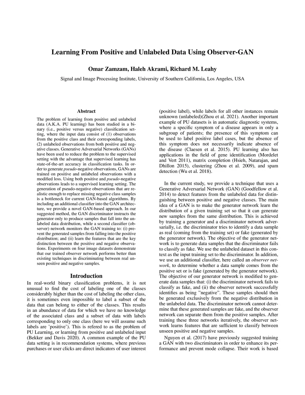 Learning From Positive and Unlabeled Data Using Observer-GAN