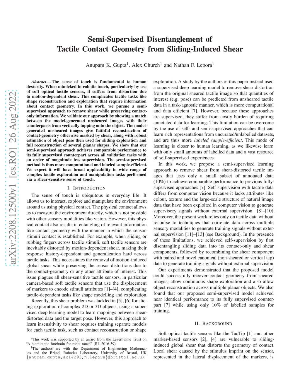 The sense of touch is fundamental to human dexterity. When mimicked in robotic touch, particularly by use of soft optical tactile sensors, it suffers from distortion due to motion-dependent shear. This complicates tactile tasks like shape reconstruction and exploration that require information about contact geometry. In this work, we pursue a semi-supervised approach to remove shear while preserving contact-only information. We validate our approach by showing a match between the model-generated unsheared images with their counterparts from vertically tapping onto the object. The model-generated unsheared images give faithful reconstruction of contact-geometry otherwise masked by shear, along with robust estimation of object pose then used for sliding exploration and full reconstruction of several planar shapes. We show that our semi-supervised approach achieves comparable performance to its fully supervised counterpart across all validation tasks with an order of magnitude less supervision. The semi-supervised method is thus more computational and labeled sample-efficient. We expect it will have broad applicability to wide range of complex tactile exploration and manipulation tasks performed via a shear-sensitive sense of touch.