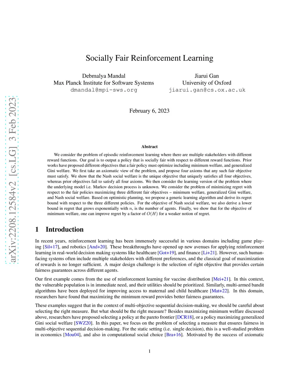 We consider the problem of episodic reinforcement learning where there are multiple stakeholders with different reward functions. Our goal is to output a policy that is socially fair with respect to different reward functions. Prior works have proposed different objectives that a fair policy must optimize including minimum welfare, and generalized Gini welfare. We first take an axiomatic view of the problem, and propose four axioms that any such fair objective must satisfy. We show that the Nash social welfare is the unique objective that uniquely satisfies all four objectives, whereas prior objectives fail to satisfy all four axioms. We then consider the learning version of the problem where the underlying model i.e. Markov decision process is unknown. We consider the problem of minimizing regret with respect to the fair policies maximizing three different fair objectives -- minimum welfare, generalized Gini welfare, and Nash social welfare. Based on optimistic planning, we propose a generic learning algorithm and derive its regret bound with respect to the three different policies. For the objective of Nash social welfare, we also derive a lower bound in regret that grows exponentially with , the number of agents. Finally, we show that for the objective of minimum welfare, one can improve regret by a factor of for a weaker notion of regret.