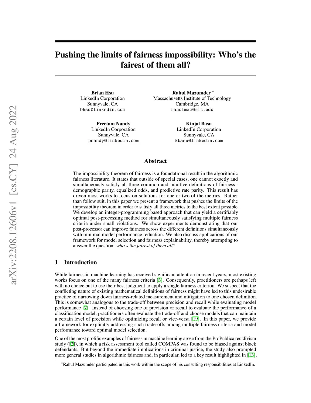 The impossibility theorem of fairness is a foundational result in the algorithmic fairness literature. It states that outside of special cases, one cannot exactly and simultaneously satisfy all three common and intuitive definitions of fairness - demographic parity, equalized odds, and predictive rate parity. This result has driven most works to focus on solutions for one or two of the metrics. Rather than follow suit, in this paper we present a framework that pushes the limits of the impossibility theorem in order to satisfy all three metrics to the best extent possible. We develop an integer-programming based approach that can yield a certifiably optimal post-processing method for simultaneously satisfying multiple fairness criteria under small violations. We show experiments demonstrating that our post-processor can improve fairness across the different definitions simultaneously with minimal model performance reduction. We also discuss applications of our framework for model selection and fairness explainability, thereby attempting to answer the question: who's the fairest of them all?