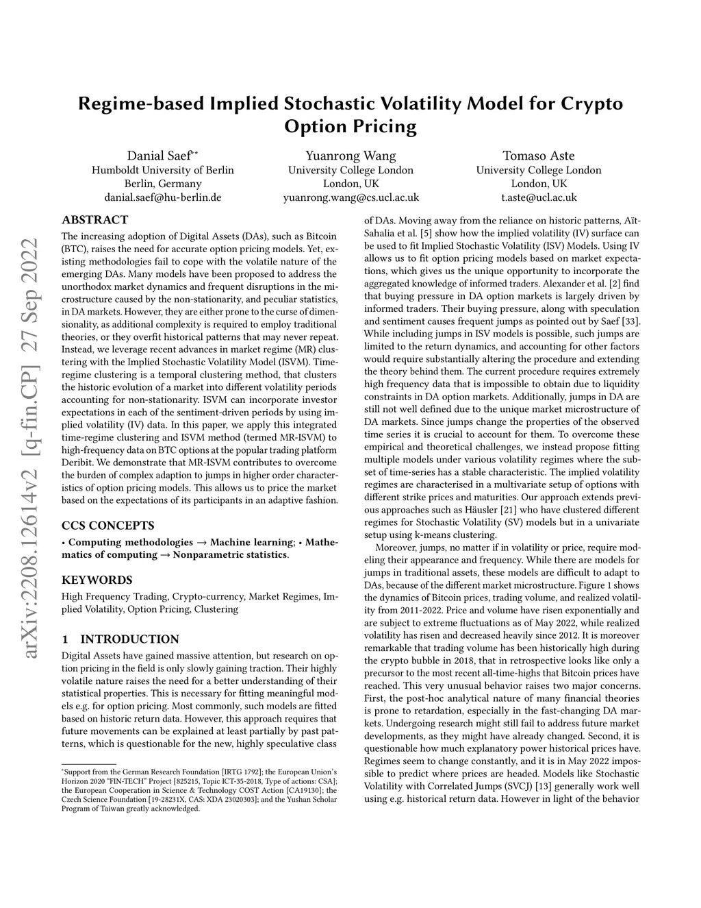 The increasing adoption of Digital Assets (DAs), such as Bitcoin (BTC), rises the need for accurate option pricing models. Yet, existing methodologies fail to cope with the volatile nature of the emerging DAs. Many models have been proposed to address the unorthodox market dynamics and frequent disruptions in the microstructure caused by the non-stationarity, and peculiar statistics, in DA markets. However, they are either prone to the curse of dimensionality, as additional complexity is required to employ traditional theories, or they overfit historical patterns that may never repeat. Instead, we leverage recent advances in market regime (MR) clustering with the Implied Stochastic Volatility Model (ISVM). Time-regime clustering is a temporal clustering method, that clusters the historic evolution of a market into different volatility periods accounting for non-stationarity. ISVM can incorporate investor expectations in each of the sentiment-driven periods by using implied volatility (IV) data. In this paper, we applied this integrated time-regime clustering and ISVM method (termed MR-ISVM) to high-frequency data on BTC options at the popular trading platform Deribit. We demonstrate that MR-ISVM contributes to overcome the burden of complex adaption to jumps in higher order characteristics of option pricing models. This allows us to price the market based on the expectations of its participants in an adaptive fashion.