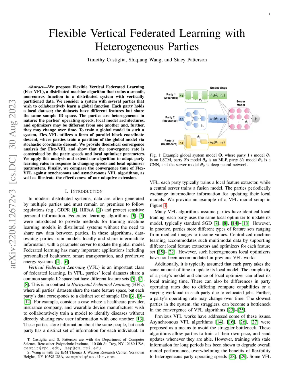 We propose Flexible Vertical Federated Learning (Flex-VFL), a distributed machine algorithm that trains a smooth, non-convex function in a distributed system with vertically partitioned data. We consider a system with several parties that wish to collaboratively learn a global function. Each party holds a local dataset; the datasets have different features but share the same sample ID space. The parties are heterogeneous in nature: the parties' operating speeds, local model architectures, and optimizers may be different from one another and, further, they may change over time. To train a global model in such a system, Flex-VFL utilizes a form of parallel block coordinate descent, where parties train a partition of the global model via stochastic coordinate descent. We provide theoretical convergence analysis for Flex-VFL and show that the convergence rate is constrained by the party speeds and local optimizer parameters. We apply this analysis and extend our algorithm to adapt party learning rates in response to changing speeds and local optimizer parameters. Finally, we compare the convergence time of Flex-VFL against synchronous and asynchronous VFL algorithms, as well as illustrate the effectiveness of our adaptive extension.