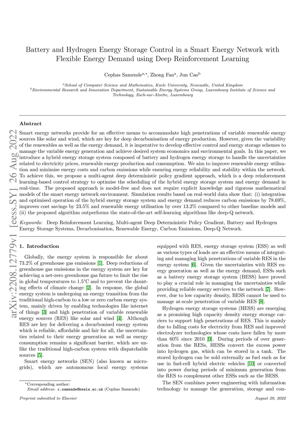 Battery and Hydrogen Energy Storage Control in a Smart Energy Network