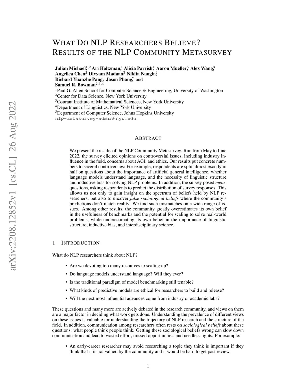We present the results of the NLP Community Metasurvey. Run from May to June 2022, the survey elicited opinions on controversial issues, including industry influence in the field, concerns about AGI, and ethics. Our results put concrete numbers to several controversies: For example, respondents are split almost exactly in half on questions about the importance of artificial general intelligence, whether language models understand language, and the necessity of linguistic structure and inductive bias for solving NLP problems. In addition, the survey posed meta-questions, asking respondents to predict the distribution of survey responses. This allows us not only to gain insight on the spectrum of beliefs held by NLP researchers, but also to uncover false sociological beliefs where the community's predictions don't match reality. We find such mismatches on a wide range of issues. Among other results, the community greatly overestimates its own belief in the usefulness of benchmarks and the potential for scaling to solve real-world problems, while underestimating its own belief in the importance of linguistic structure, inductive bias, and interdisciplinary science.