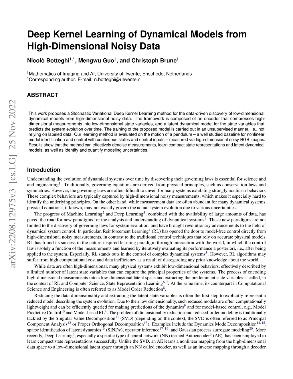 This work proposes a Stochastic Variational Deep Kernel Learning method for the data-driven discovery of low-dimensional dynamical models from high-dimensional noisy data. The framework is composed of an encoder that compresses high-dimensional measurements into low-dimensional state variables, and a latent dynamical model for the state variables that predicts the system evolution over time. The training of the proposed model is carried out in an unsupervised manner, i.e., not relying on labeled data. Our learning method is evaluated on the motion of a pendulum -- a well studied baseline for nonlinear model identification and control with continuous states and control inputs -- measured via high-dimensional noisy RGB images. Results show that the method can effectively denoise measurements, learn compact state representations and latent dynamical models, as well as identify and quantify modeling uncertainties.