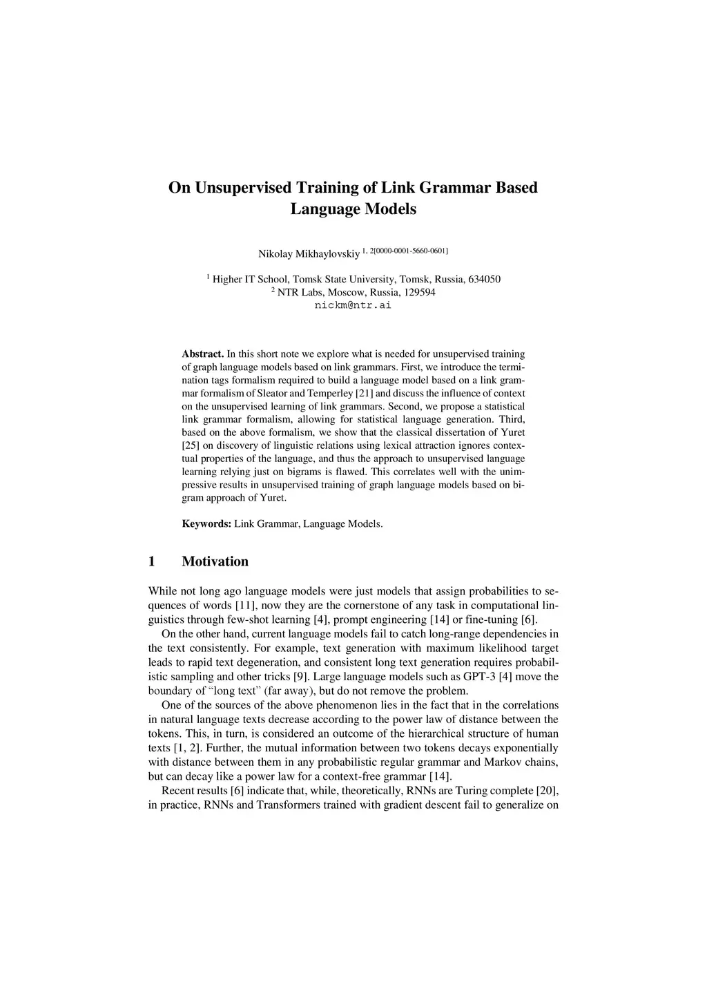 In this short note we explore what is needed for the unsupervised training of graph language models based on link grammars. First, we introduce the ter-mination tags formalism required to build a language model based on a link grammar formalism of Sleator and Temperley [21] and discuss the influence of context on the unsupervised learning of link grammars. Second, we pro-pose a statistical link grammar formalism, allowing for statistical language generation. Third, based on the above formalism, we show that the classical dissertation of Yuret [25] on discovery of linguistic relations using lexical at-traction ignores contextual properties of the language, and thus the approach to unsupervised language learning relying just on bigrams is flawed. This correlates well with the unimpressive results in unsupervised training of graph language models based on bigram approach of Yuret.