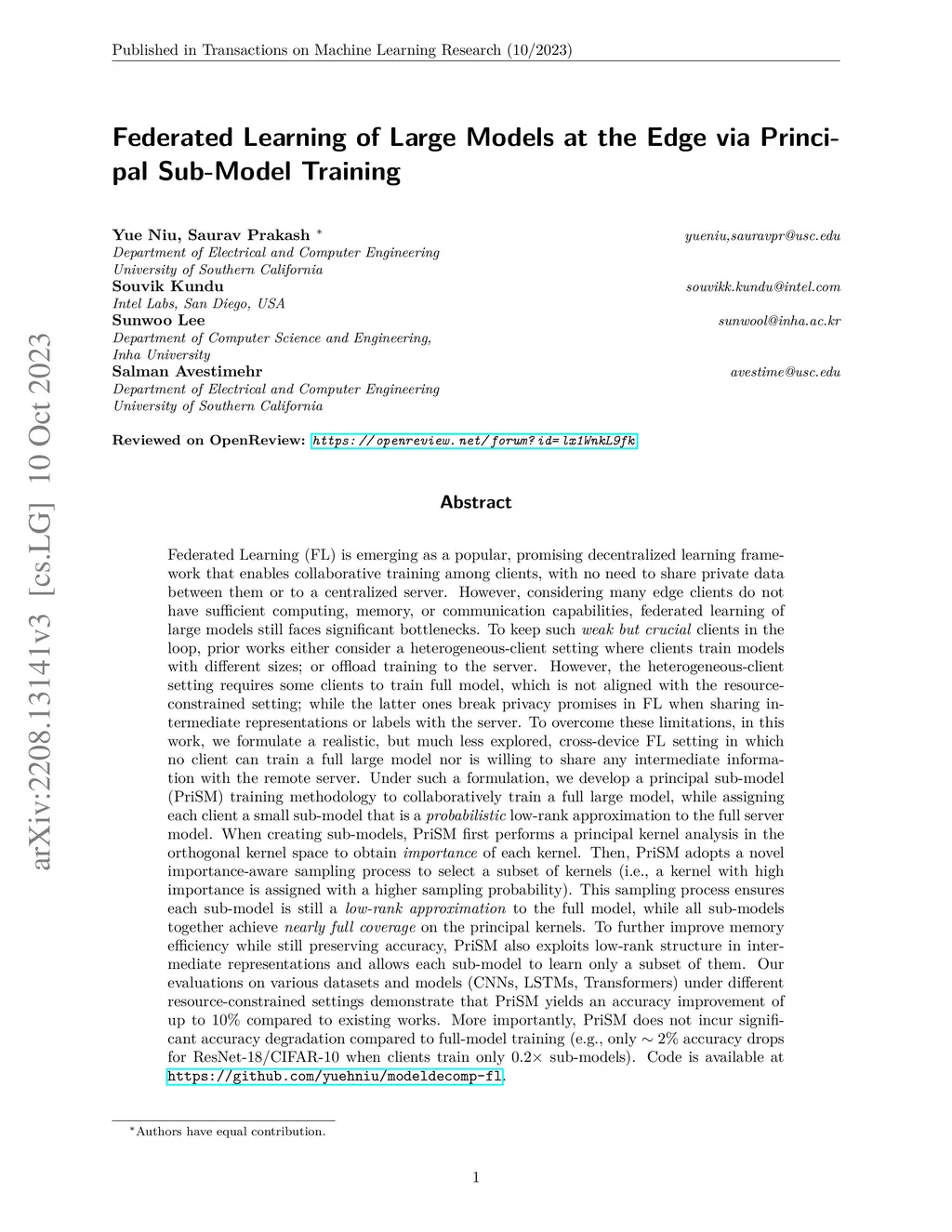 Federated Learning of Large Models at the Edge via Principal Sub-Model