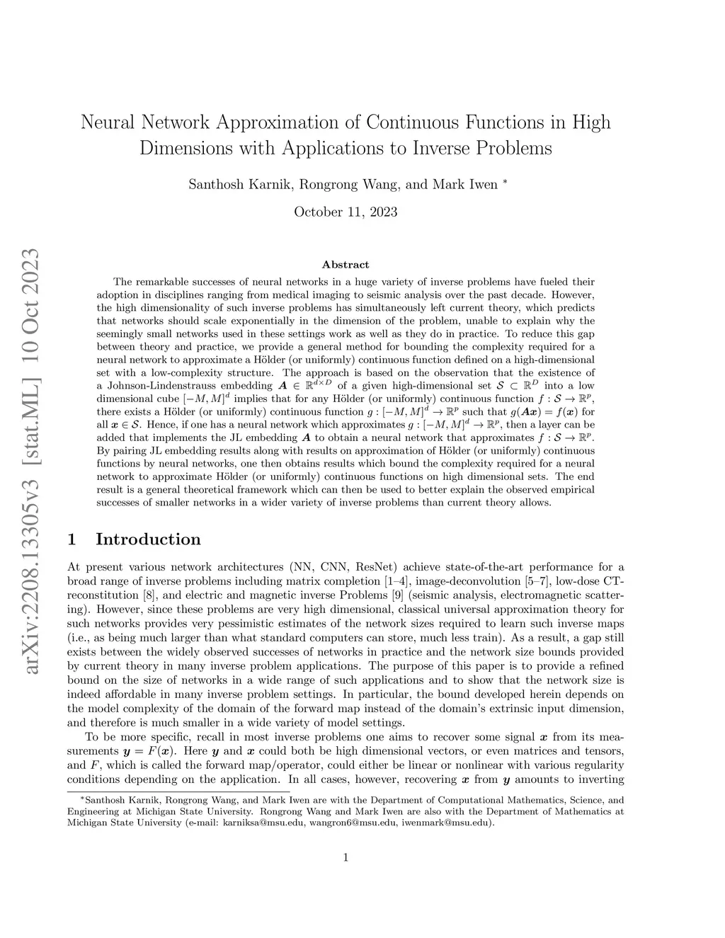 The remarkable successes of neural networks in a huge variety of inverse problems have fueled their adoption in disciplines ranging from medical imaging to seismic analysis over the past decade. However, the high dimensionality of such inverse problems has simultaneously left current theory, which predicts that networks should scale exponentially in the dimension of the problem, unable to explain why the seemingly small networks used in these settings work as well as they do in practice. To reduce this gap between theory and practice, we provide a general method for bounding the complexity required for a neural network to approximate a H\"older (or uniformly) continuous function defined on a high-dimensional set with a low-complexity structure. The approach is based on the observation that the existence of a Johnson-Lindenstrauss embedding of a given high-dimensional set into a low dimensional cube implies that for any H\"older (or uniformly) continuous function , there exists a H\"older (or uniformly) continuous function such that for all . Hence, if one has a neural network which approximates , then a layer can be added that implements the JL embedding to obtain a neural network that approximates . By pairing JL embedding results along with results on approximation of H\"older (or uniformly) continuous functions by neural networks, one then obtains results which bound the complexity required for a neural network to approximate H\"older (or uniformly) continuous functions on high dimensional sets. The end result is a general theoretical framework which can then be used to better explain the observed empirical successes of smaller networks in a wider variety of inverse problems than current theory allows.
